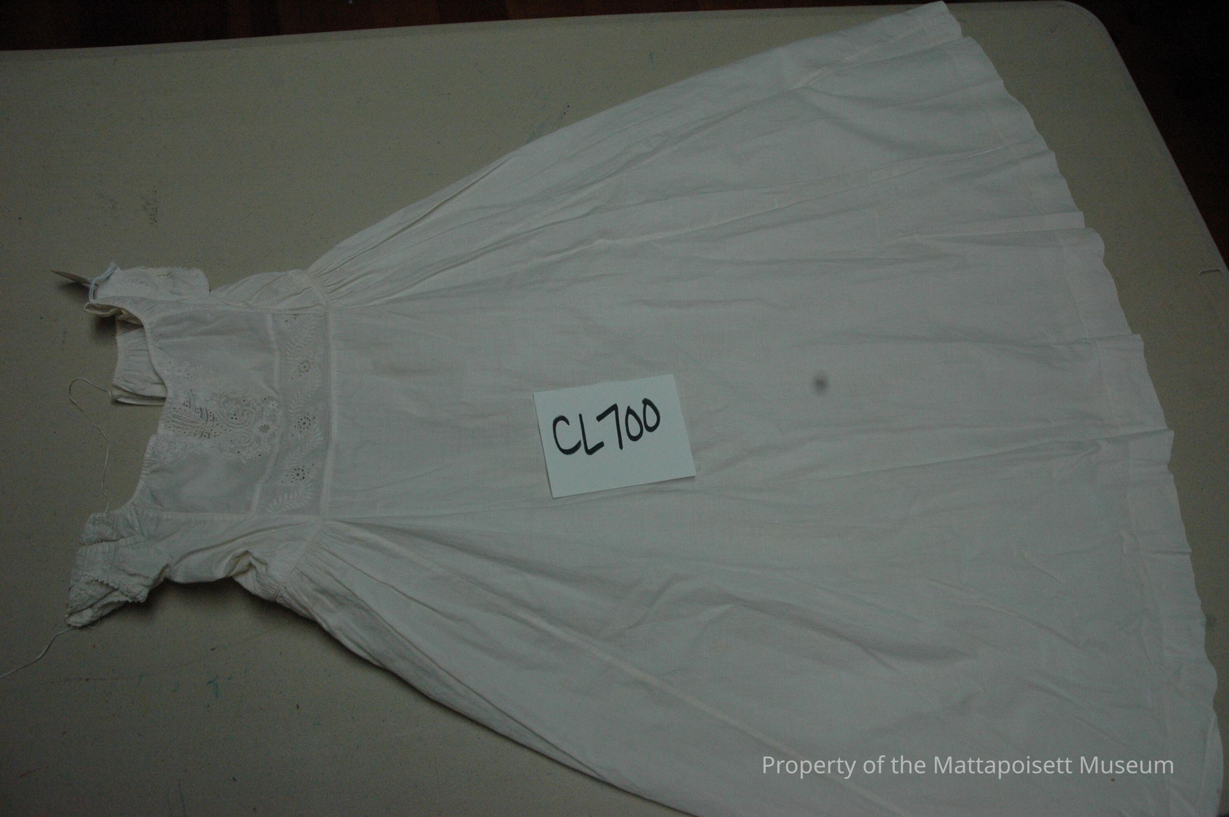Notes: Notecard: Child's white nightdress, cotton, hand embroidered yoke.