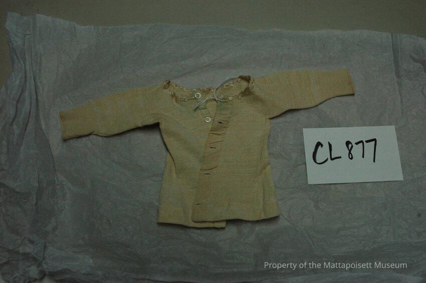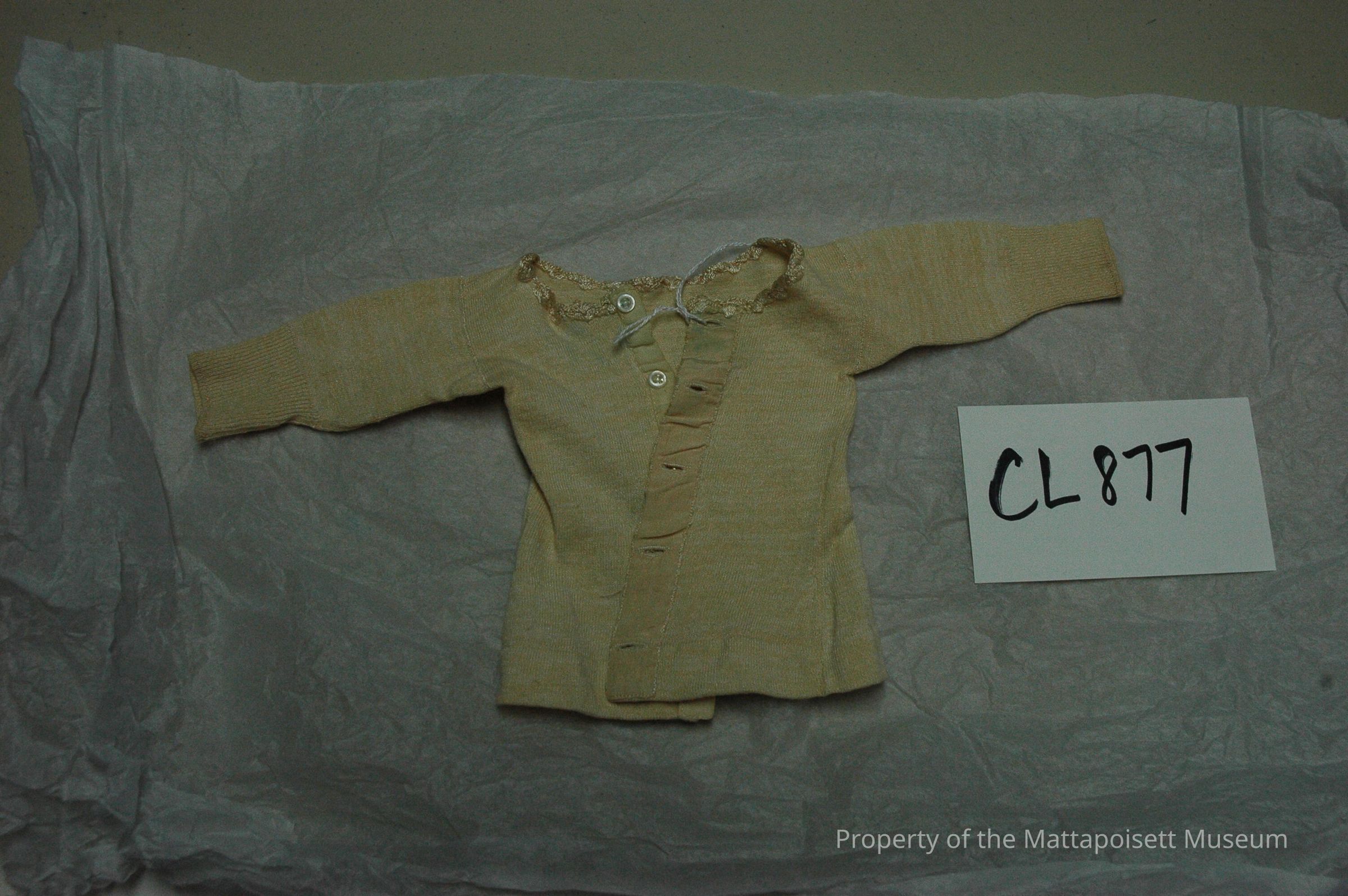 Notes: Notecard: Baby sweater. Embroidery around neck, satin ribbon where button holes are. Wool, ecru.
