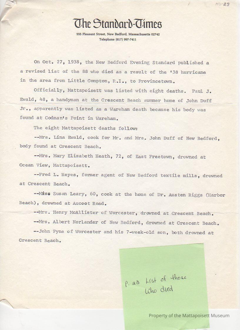 List of people who died as a result of the '38 hurricane from Mattapoisett. Eight deaths total as reported by the New Bedford Standard-Times on October 27, 1938.Collection