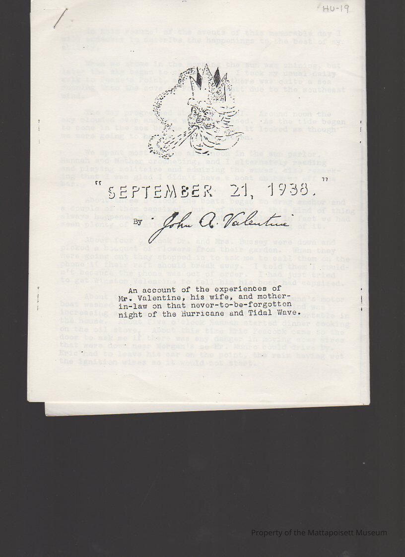 An account of the experiences of Mr. John A. Valentine, his wife, and mother-in-law on that never-to-be-forgotten night of the Hurricane and Tidal Wave. September 21, 1938.Collection