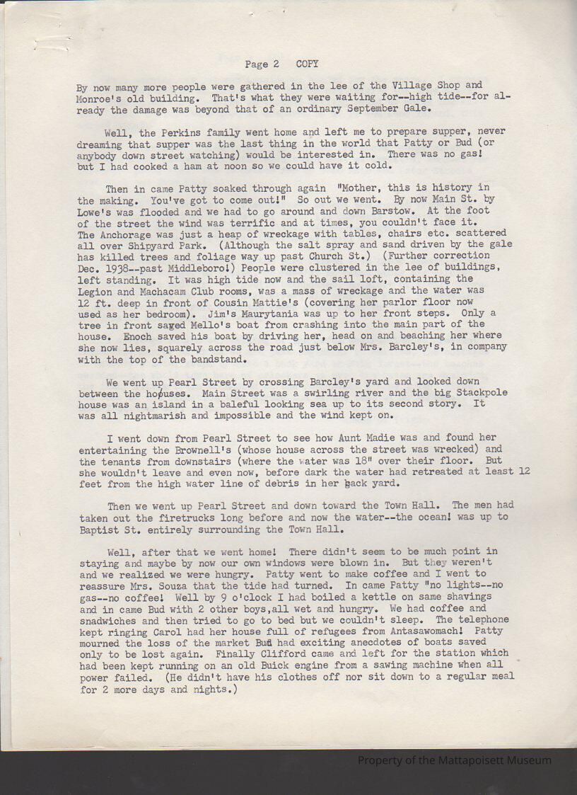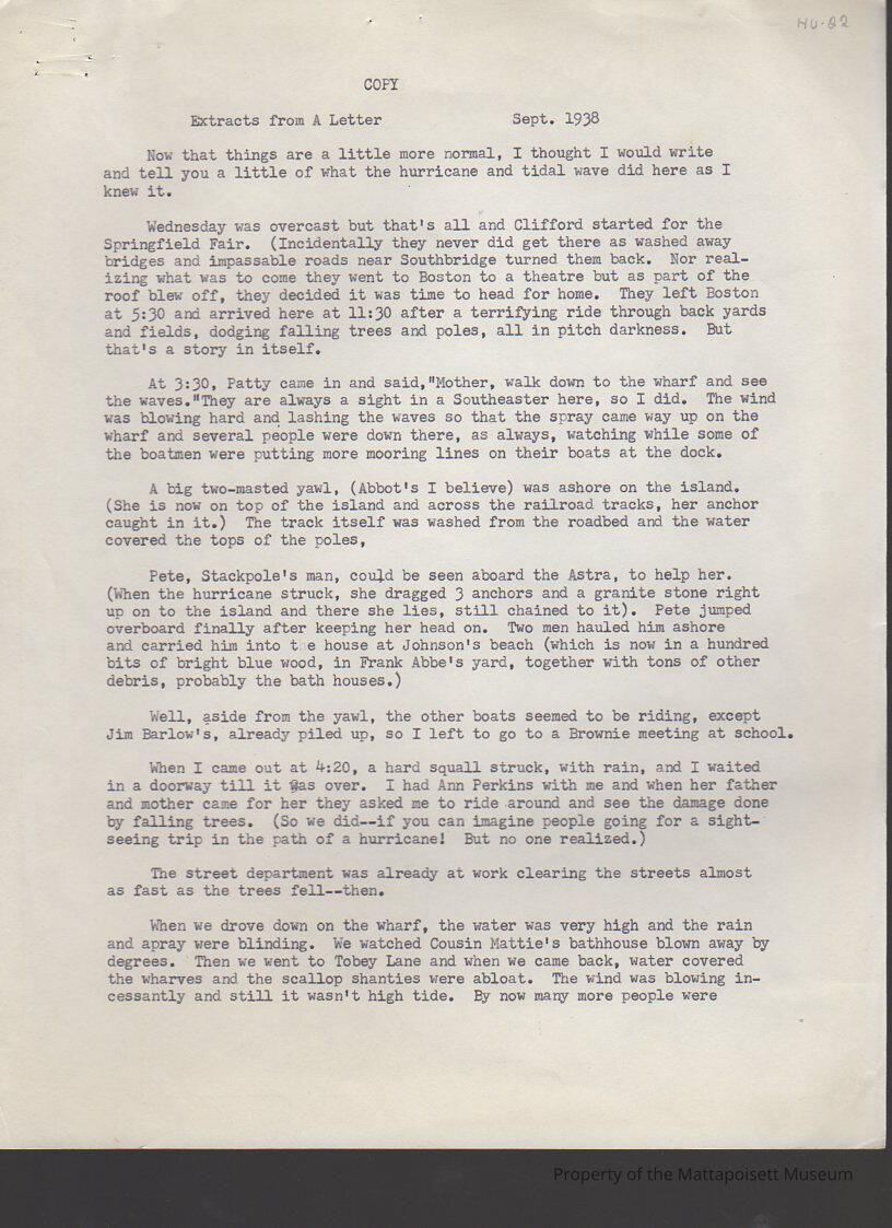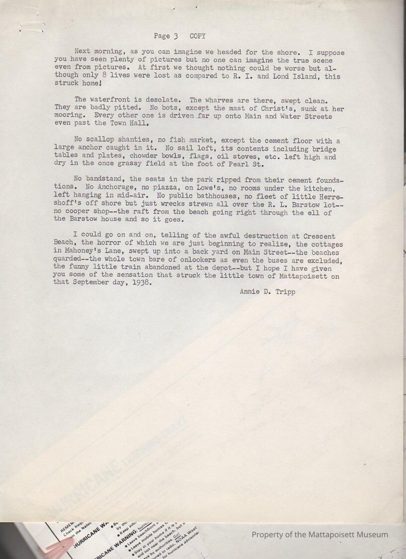 Copy of extracts from a letter from Annie D. Tripp about 1938 Hurricane and Tidal WaveCollection