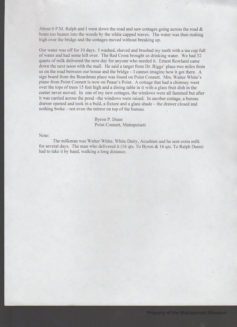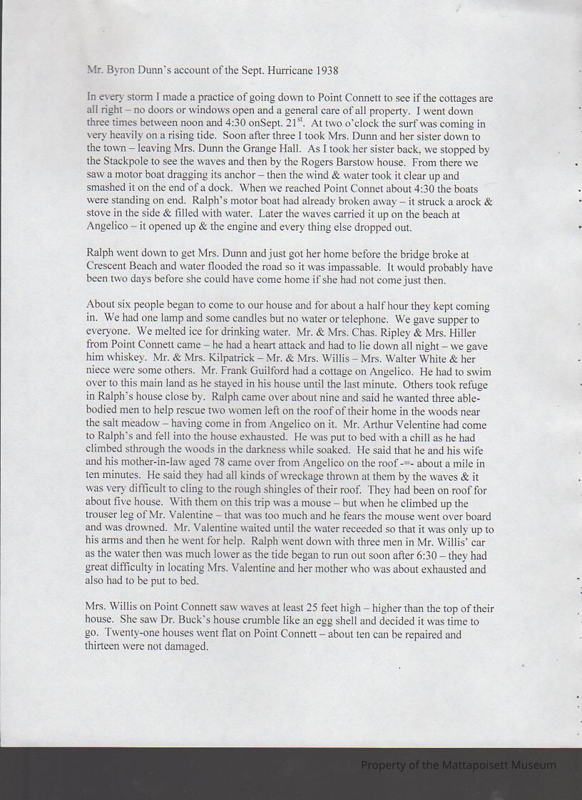 Mr. Byron Dunn's account of the September Hurricane in 1938, Point Connett.Collection