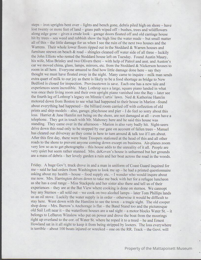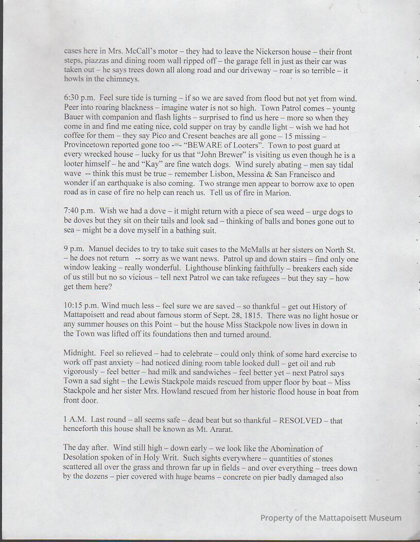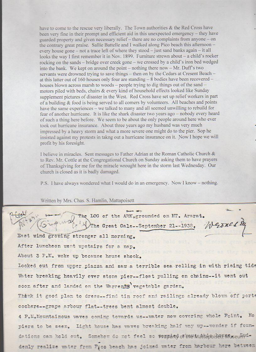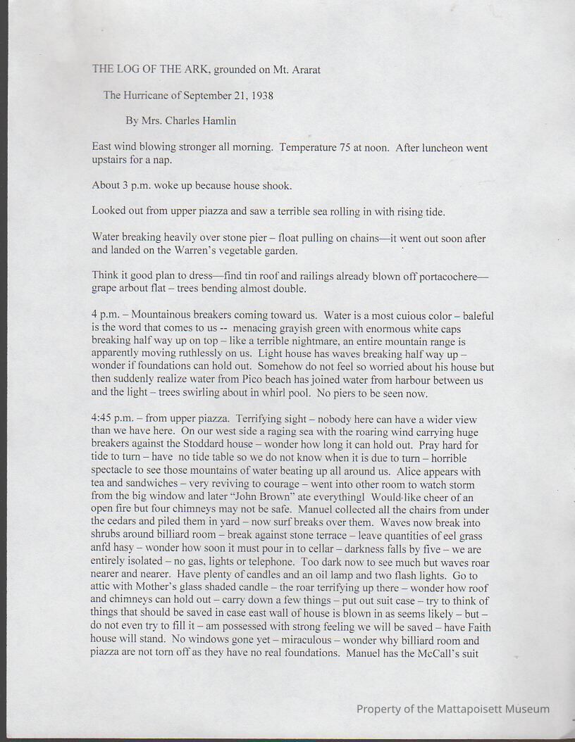 "Log of the Ark", grounded on Mt. Ararat. The Hurricane of September 21, 1938 by Mrs. Charles Hamlin. Two copies.Collection