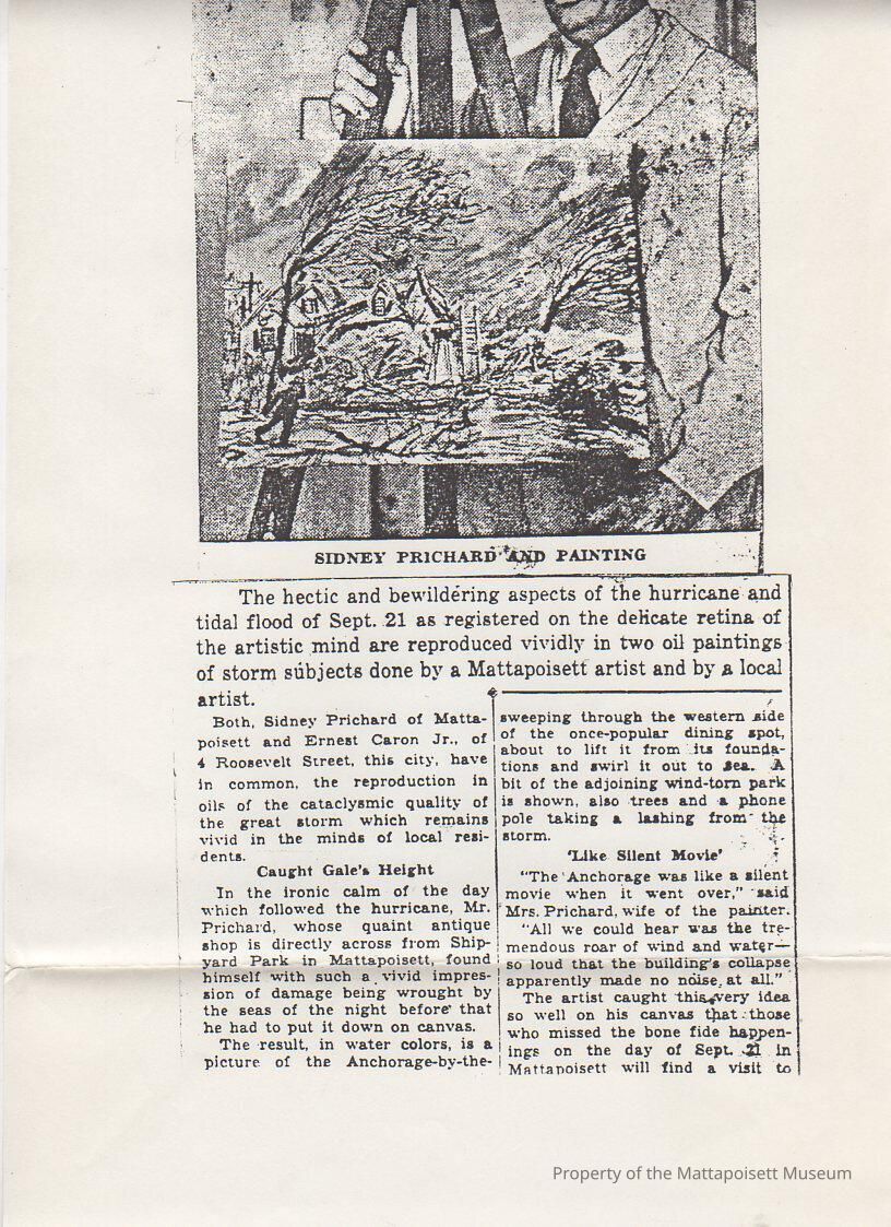 "Sidney Prichard and Painting", artist depicting "hectic and bewildering aspects of the hurricane and tidal flood of Sept. 21"Collection