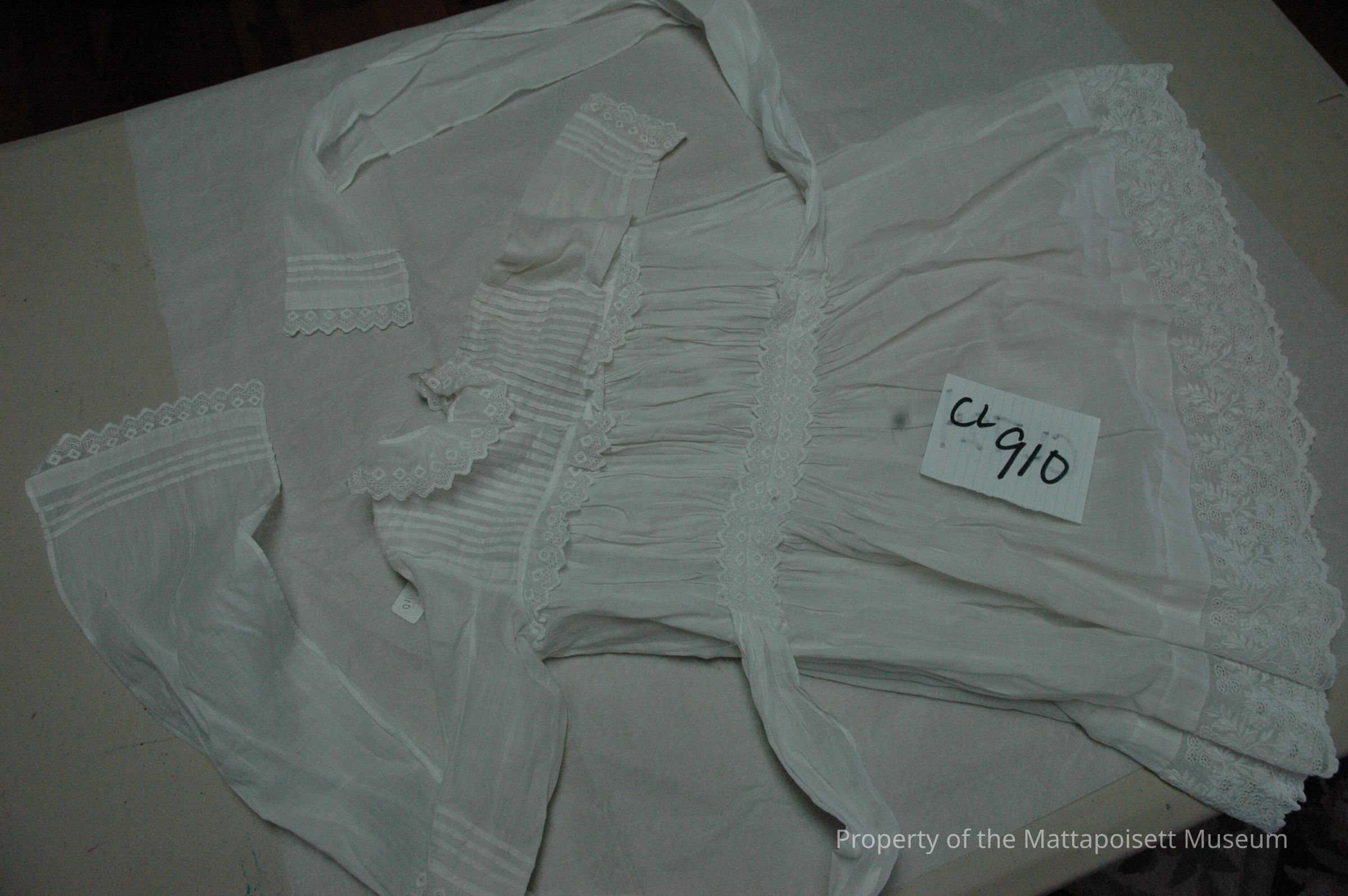 Notes: Notecard: White child's dress. Lawn, vertical pleats. Horizontal pleats on sleeves and sash. Embroidery.