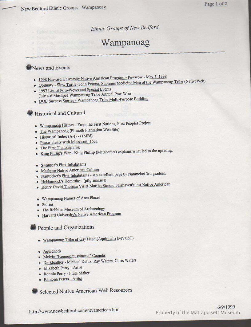 Research print out of Ethnic Groups of New Bedford, focusing on Wampanoag.Collection