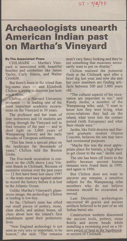 "Archaeologists unearth American Indian past on Martha's Vineyard", AP article in the Standard-TimesCollection