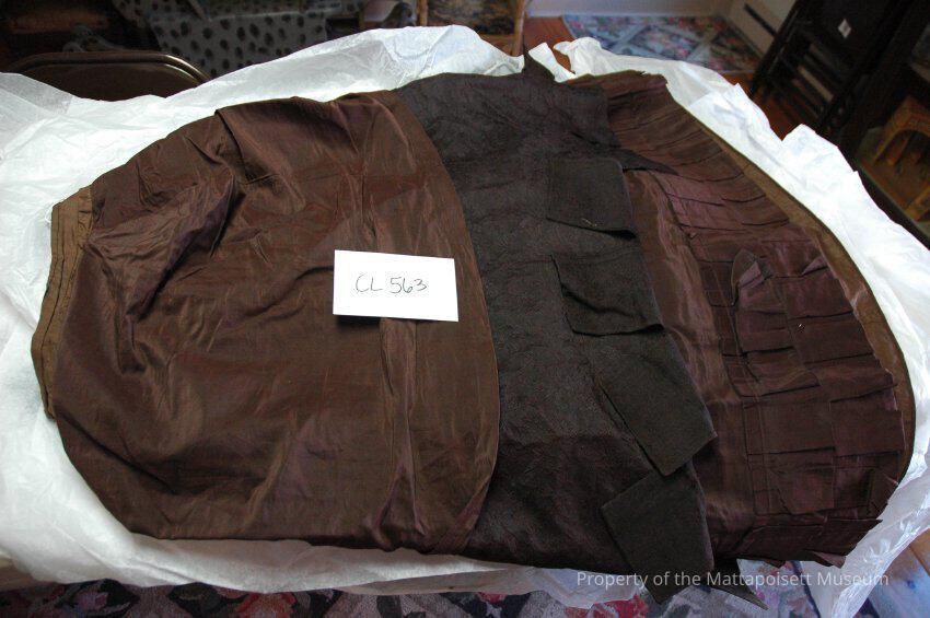 Notes: Notecard: Two piece brown satin brocade dress. Calamanco lining. Self-covered buttons. Skirt has bustle.