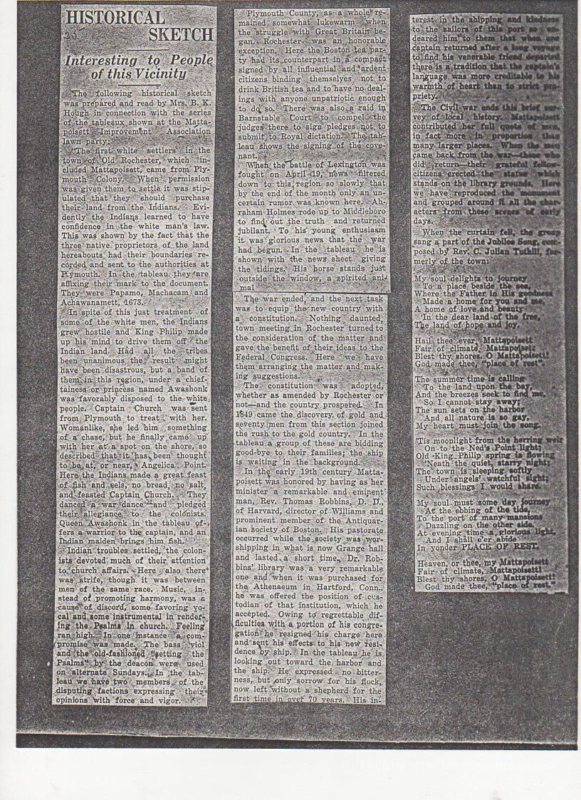 "Historical Sketch" Interesting to People of this Vicinity. Written by Mrs. B. K. Hough in connection with the series of the tableaux showing at the Mattapoisett Improvement Association lawn party.Collection
