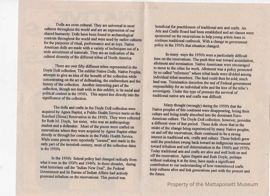 Exhibit flyer "Native Dolls, Native Peoples" for Robbins Museum of Archaeology.Collection