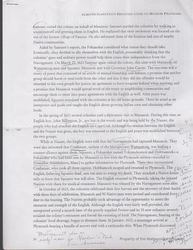Page pulled from "Plimouth Plantation Employee Guide to Museum Programs". Notes on Mattapoisett. "Mattapoisett also an early name for Garlmer's Neck in Swansea.Collection