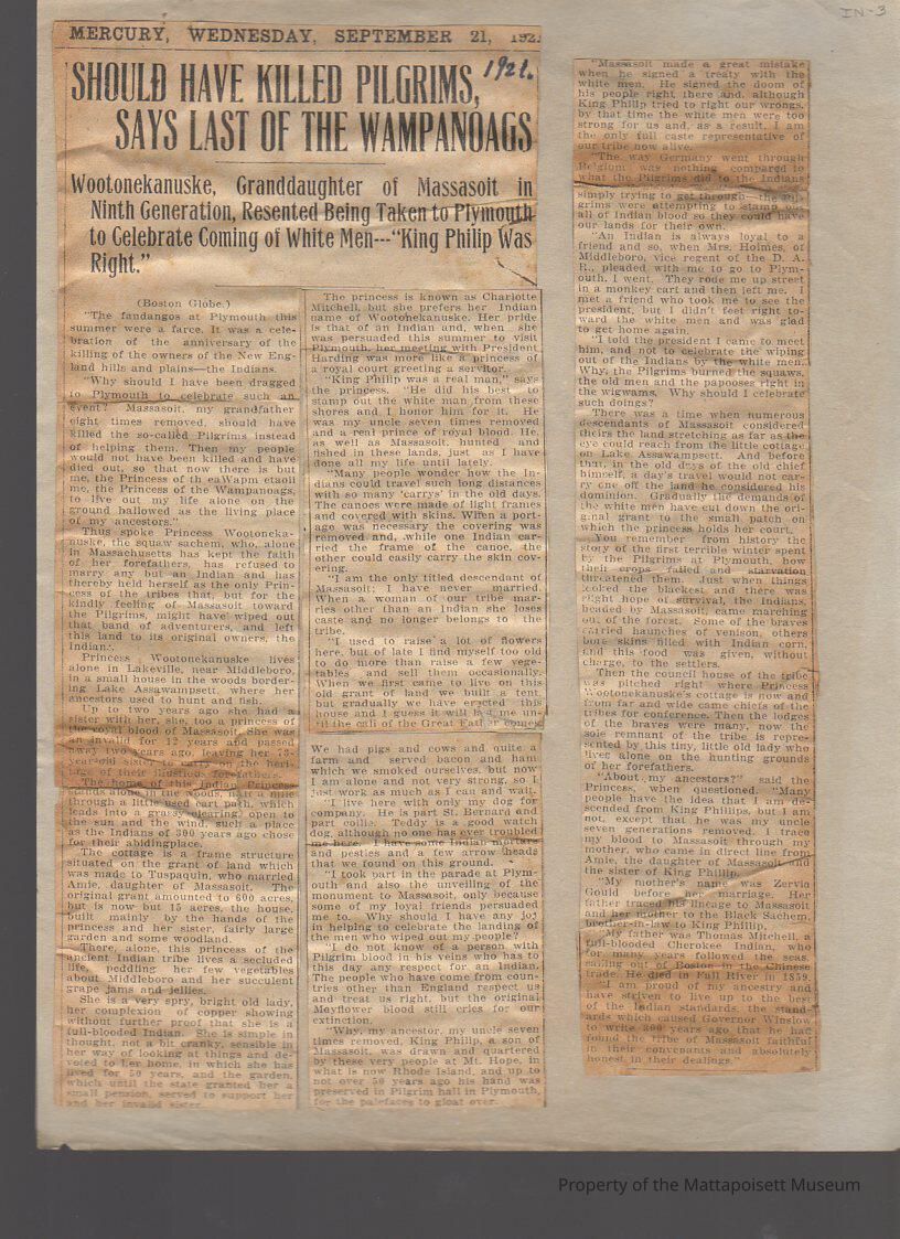 Mercury article "Should have killed Pilgrims, says last of the Wampanoags". Wootonekanuske, Grandaughter of Massasoit in Ninth Generation, Resented being taken to Plymouth to celebrate coming of white men - "King Philip was right".Collection
