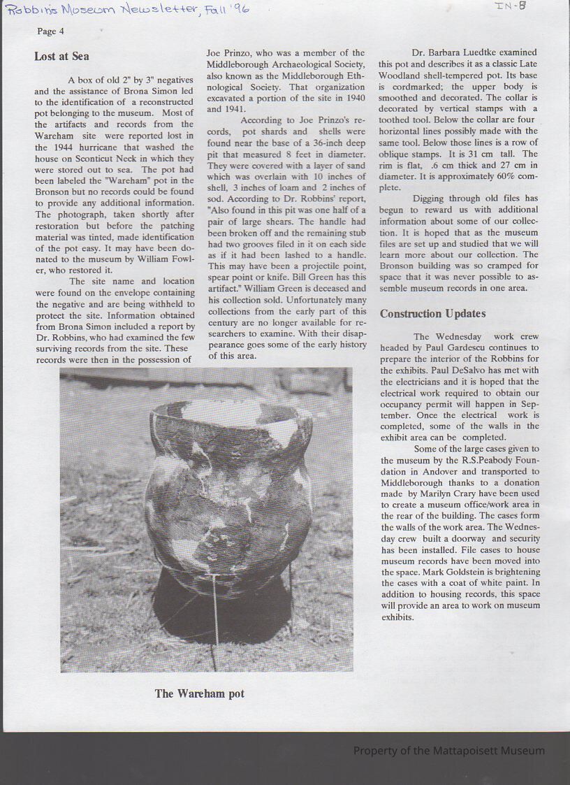 "Lost at Sea" article about pot found as "Wareham Pot". Robbins Museum Fall newsletterCollection