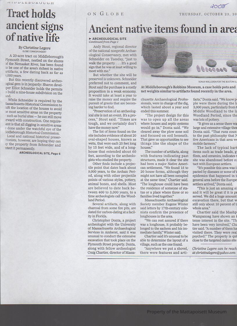 Boston Globe article "Ancient native items found in area" continued "Tract holds ancient signs of native life"Collection
