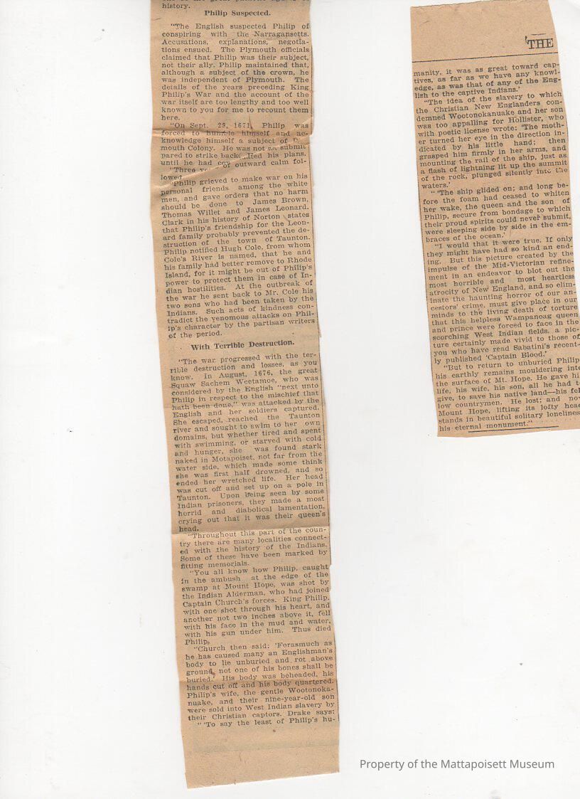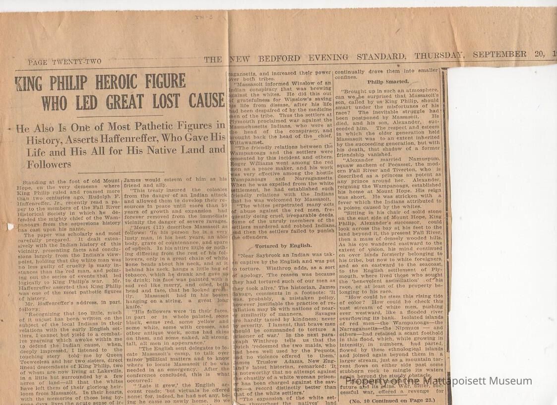 New Bedford Evening Standard, September 20 ? "King Philip Heroic Figure who led great lost cause" He also is one of most pathetic figures in history, asserts Haffenreffer, who gave his life and his all for his native land and followers.Collection