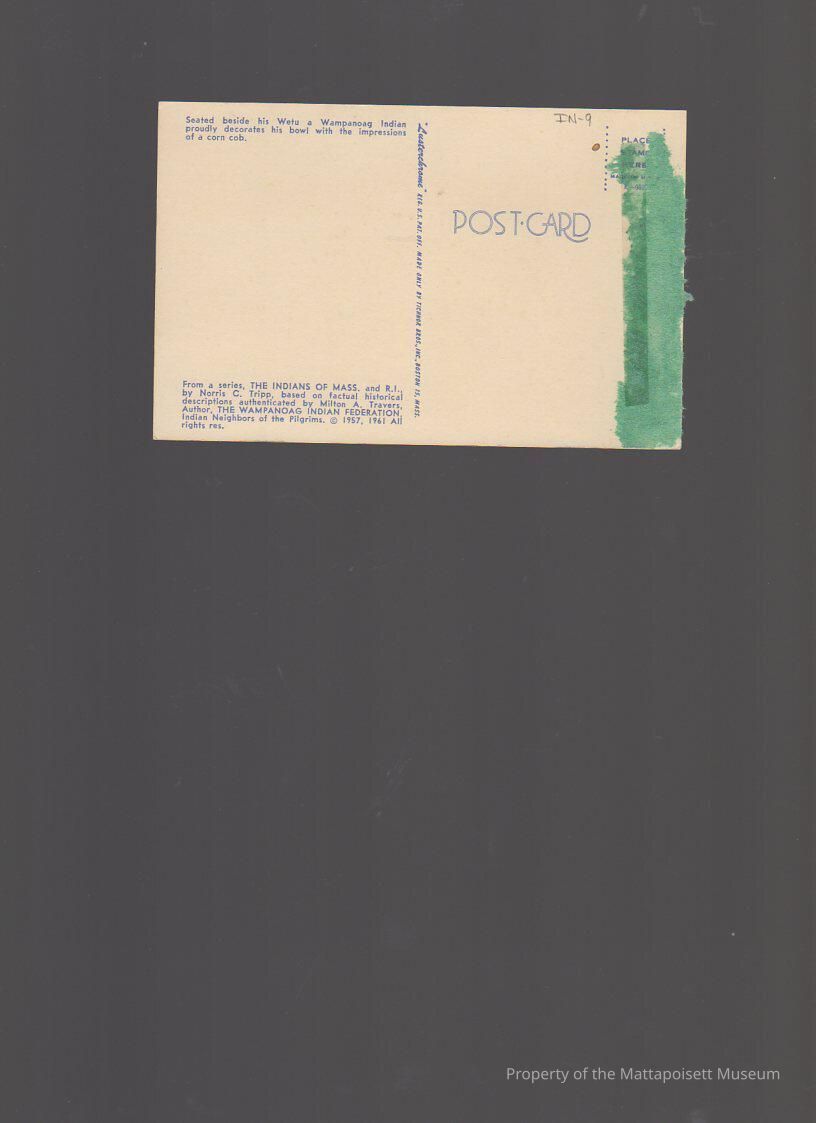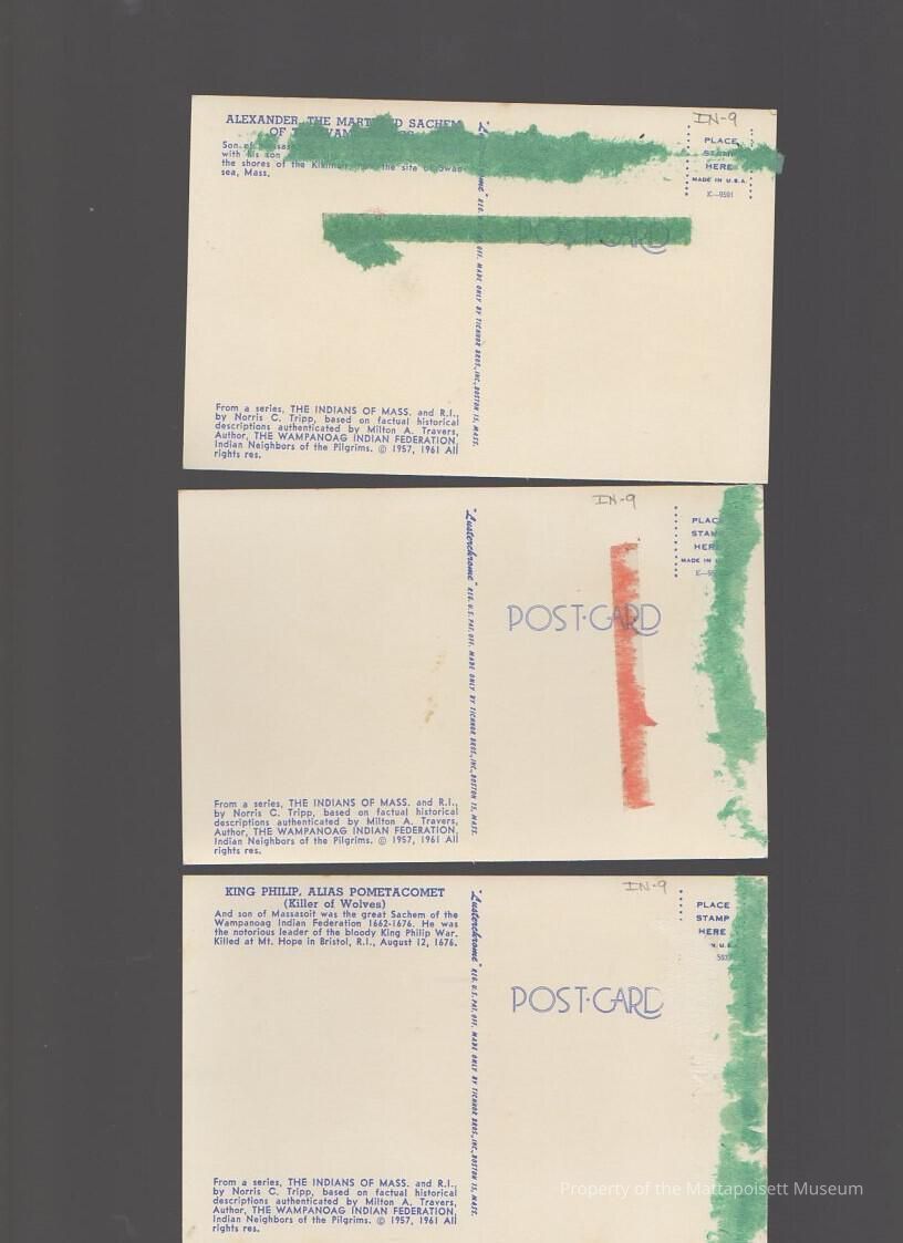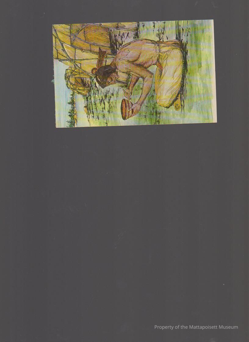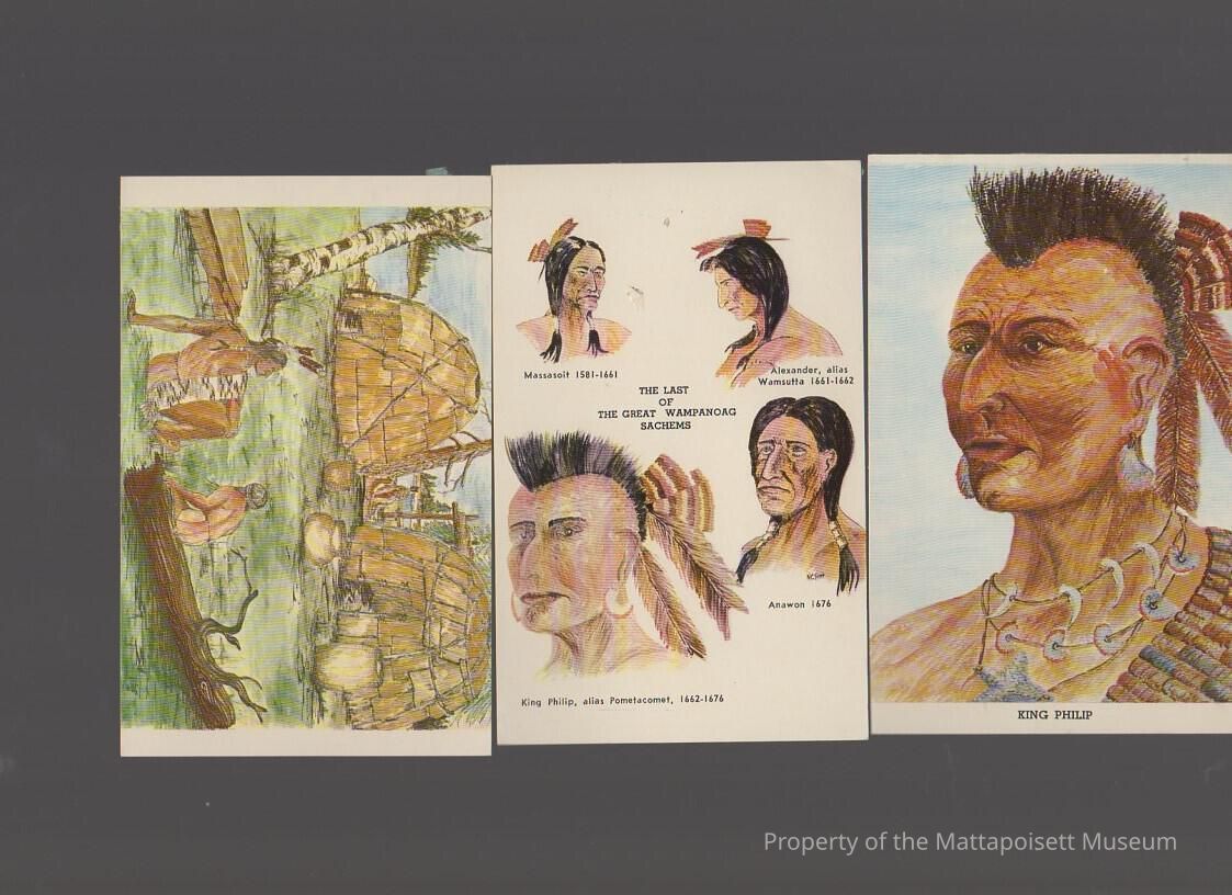 Four postcards: Series: The Indians of Mass and RI by Norris C. Tripp, based on factual historical descriptions authenticated by Milton A. Tarvers, author of The Wampanoag Indian Federation.Collection