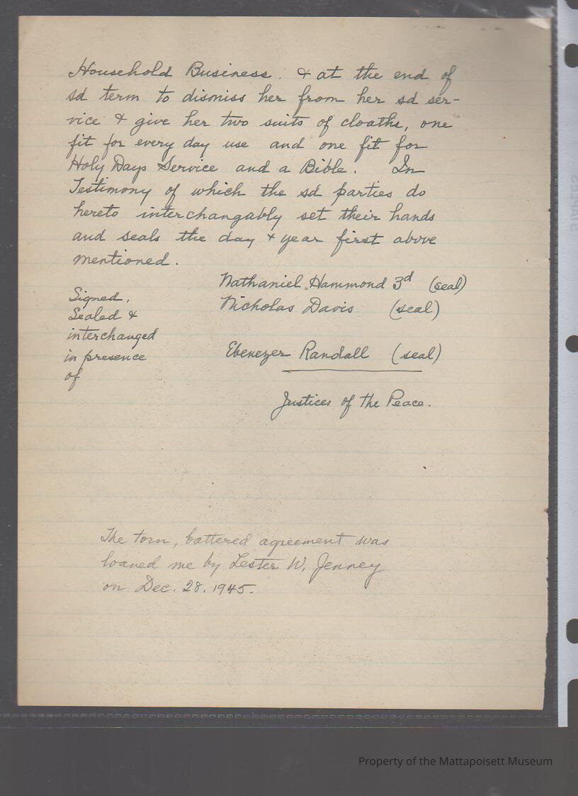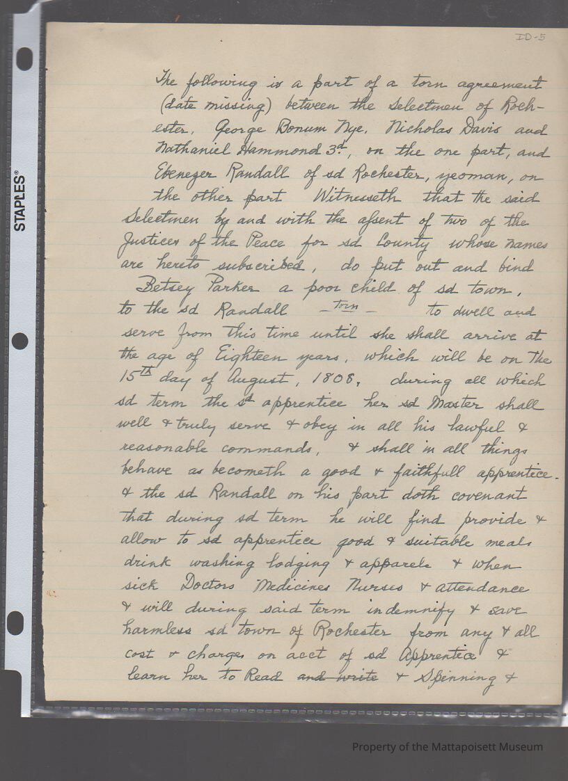 Indenture agreement (hand-written transcription of torn, battered original found in 1945) between Selectmen George Bonum Nye, Nicholas Davis and Nathaniel Hammond 3rd and Yeoman Ebenezer Randall, all of Rochester to apprentice Betsey Parker, until 1808 (18th birthday). See 0500.2.85 for original.Collection
