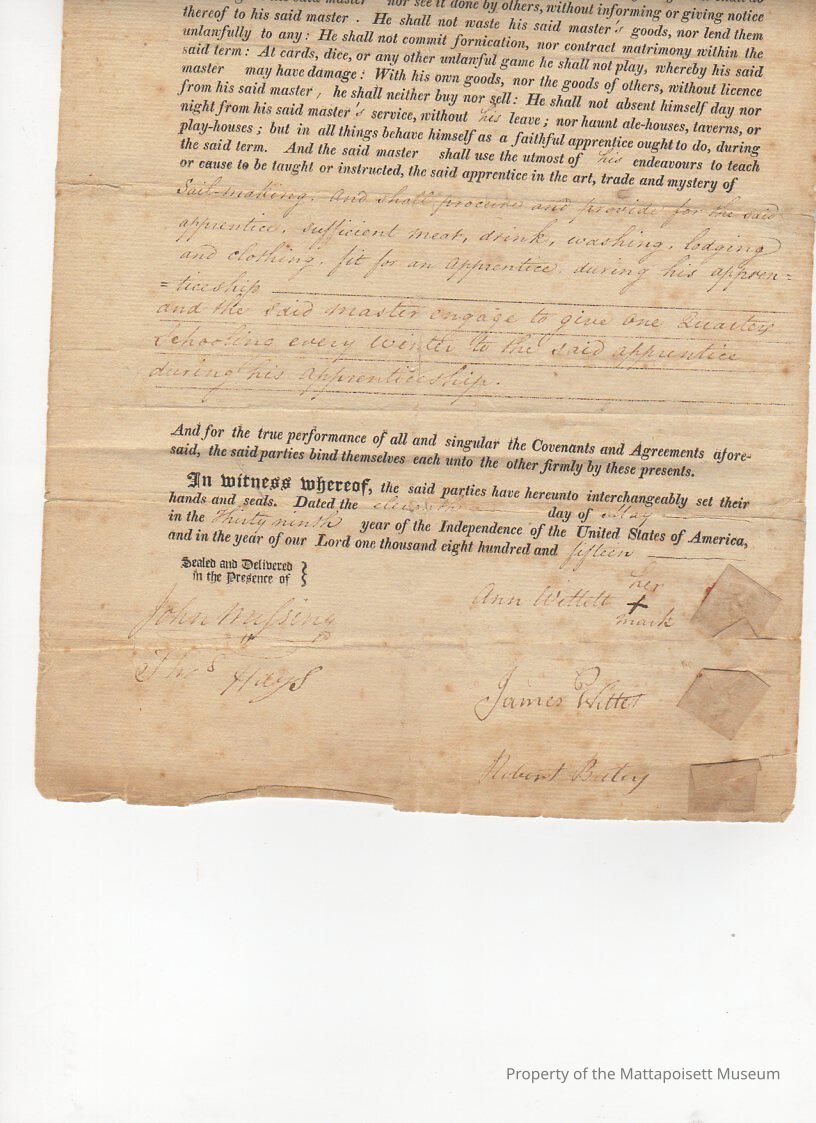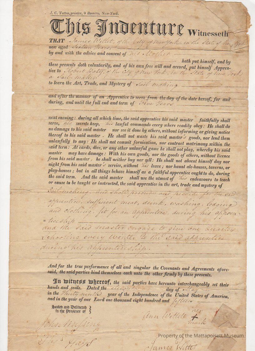 Indenture agreement between Ann [Willet] on behalf of her son James Willet, aged 16, to apprentice with Robert Batey of New York to learn the "Art, Trade, and Mystery of Sail making" for a period of five years.Collection