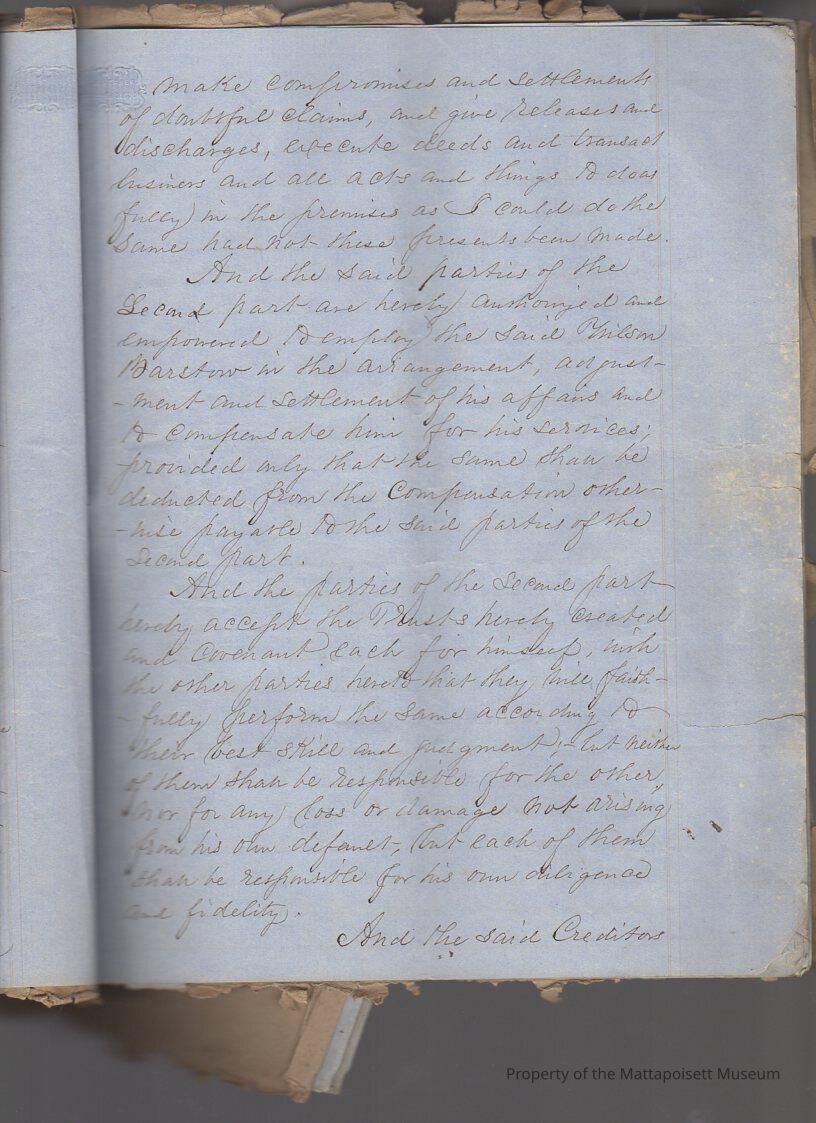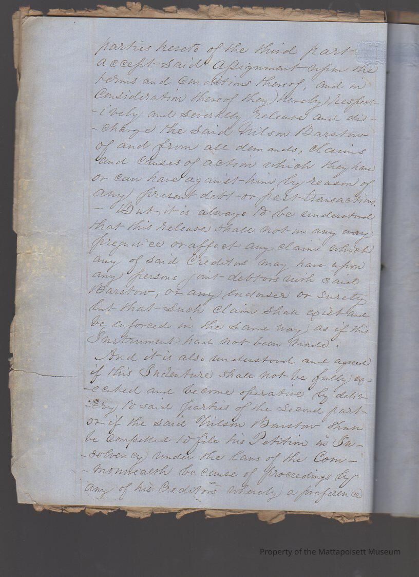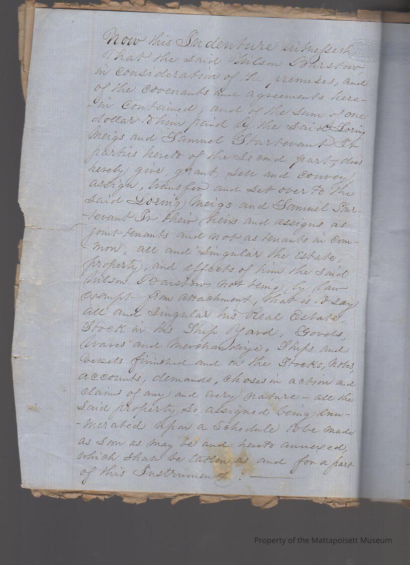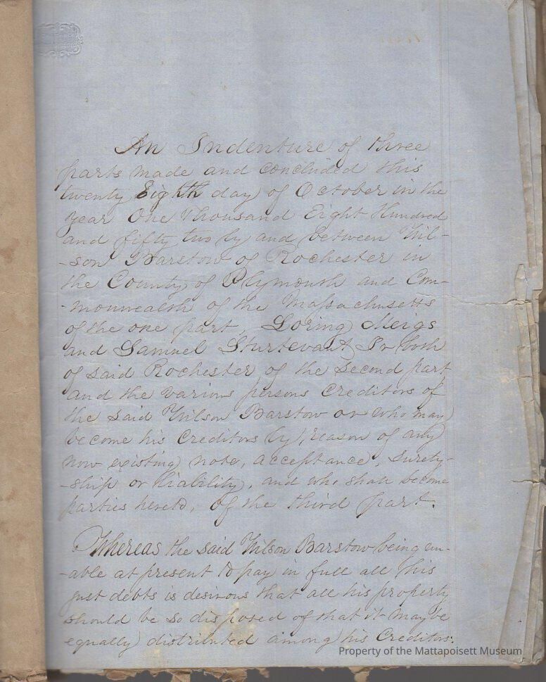 Indenture agreement in three parts between Wilson Barstow and first the Commonwealth of Massachusetts, second Loring Meigs and Samuel Sturtevant and third, creditors of Wilson Barstow, in order to pay debts. Transfer of property. Four and a half pages ofCollection