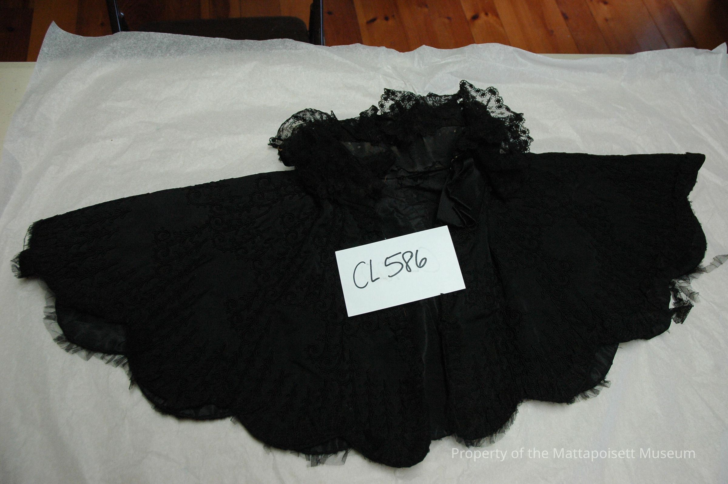 Notes: Notecard: Black taffeta shoulder cape. Satin lining. Heavy black embroidery. Lace ruching.