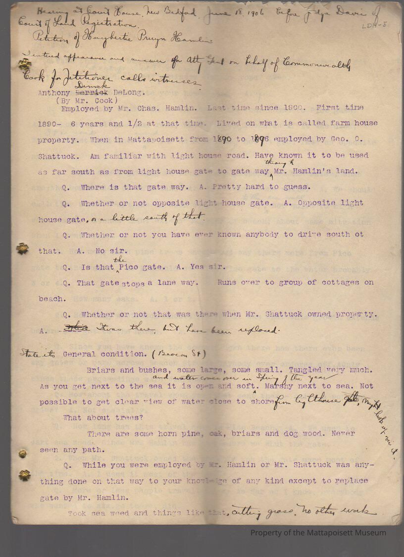 Transcript of hearing at Court House, New Bedford, June 6, 1906 before Judge Davis of Court of Land Registration. Petition of Huybertie Pruyn Hamlin. Atty Genl on behalf of Commonwealth, Cook for petitioner, calls witness Anthony [Derwick] DeLongCollection