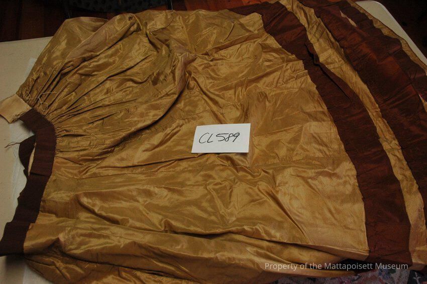 Notes: Notecard: Two piece brown and tan silk dress with long top and bustle. Brown stripes. Lace ruffles on collar and sleeves (netting). Calamanco lining.
