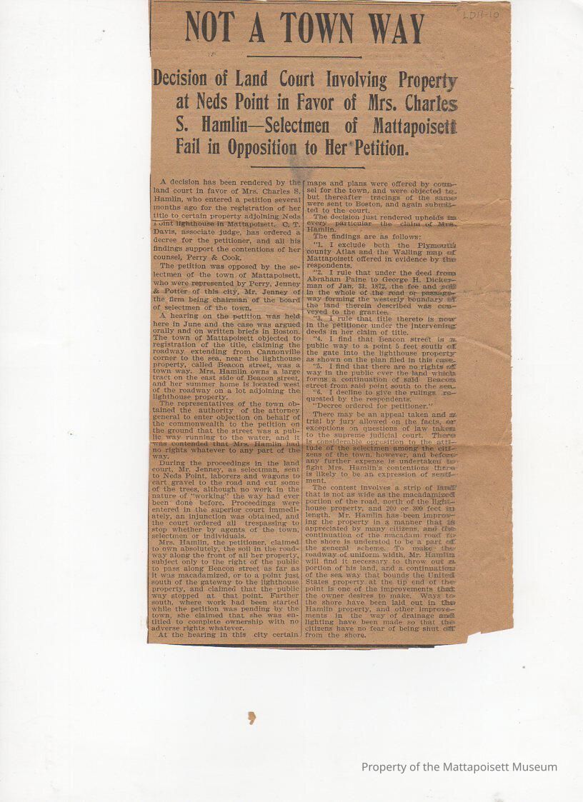 Newspaper article: Not a Town Way. Decision of Land Court involving property at Neds Point in favor of Mrs. Charles S. Hamlin - Selectmen of Mattapoisett fail in opposition to her petition.Collection