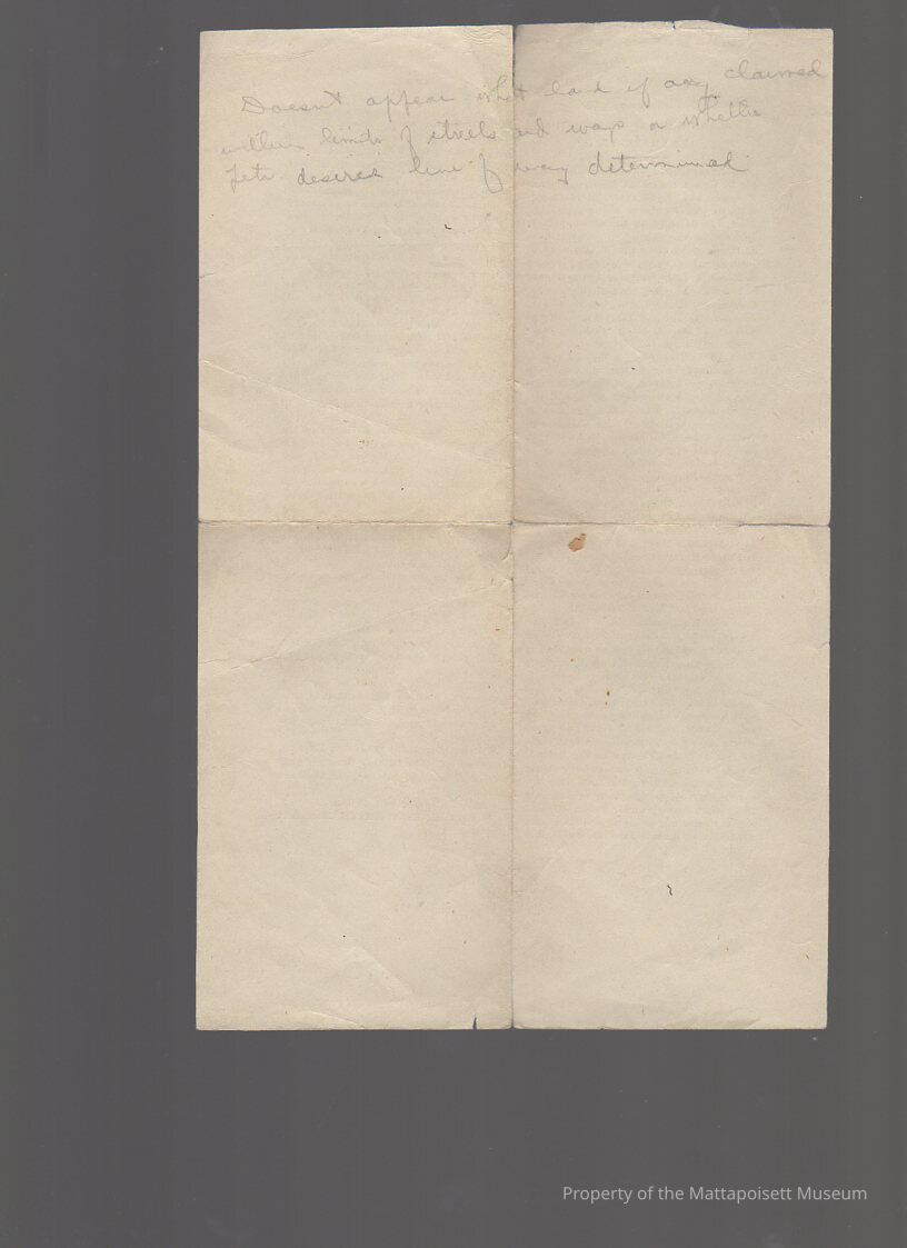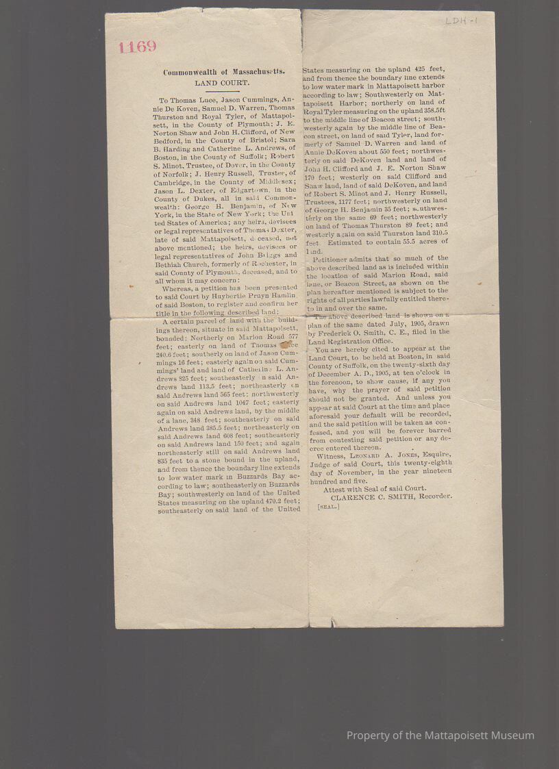 Page from "Commonwealth of Massachusetts: Land Court". Note on back "Doesn't appear what land if any claimed within limits of streets and way or [] [] desires line of way determined.Collection