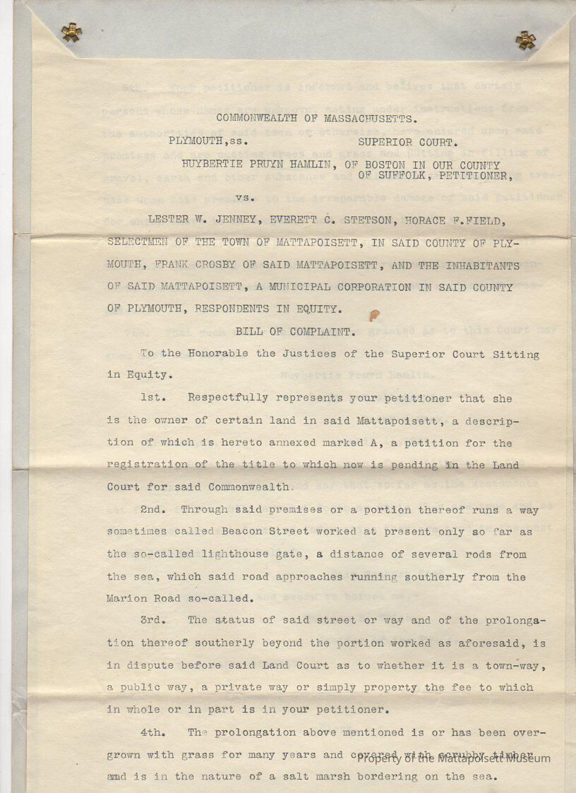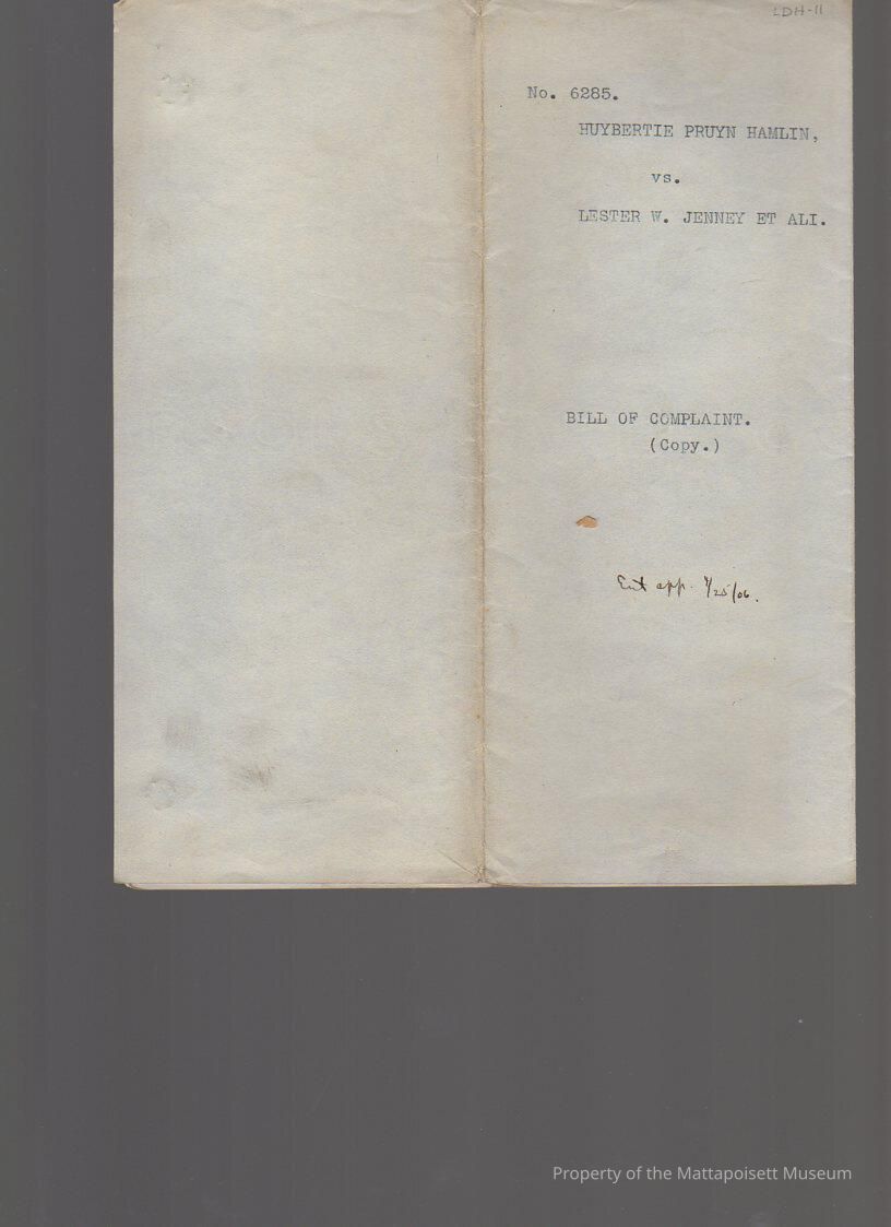 Bill of Complaint: Huybertie Pruyn Hamlin vs. Lester W. Jenney et. all.Collection