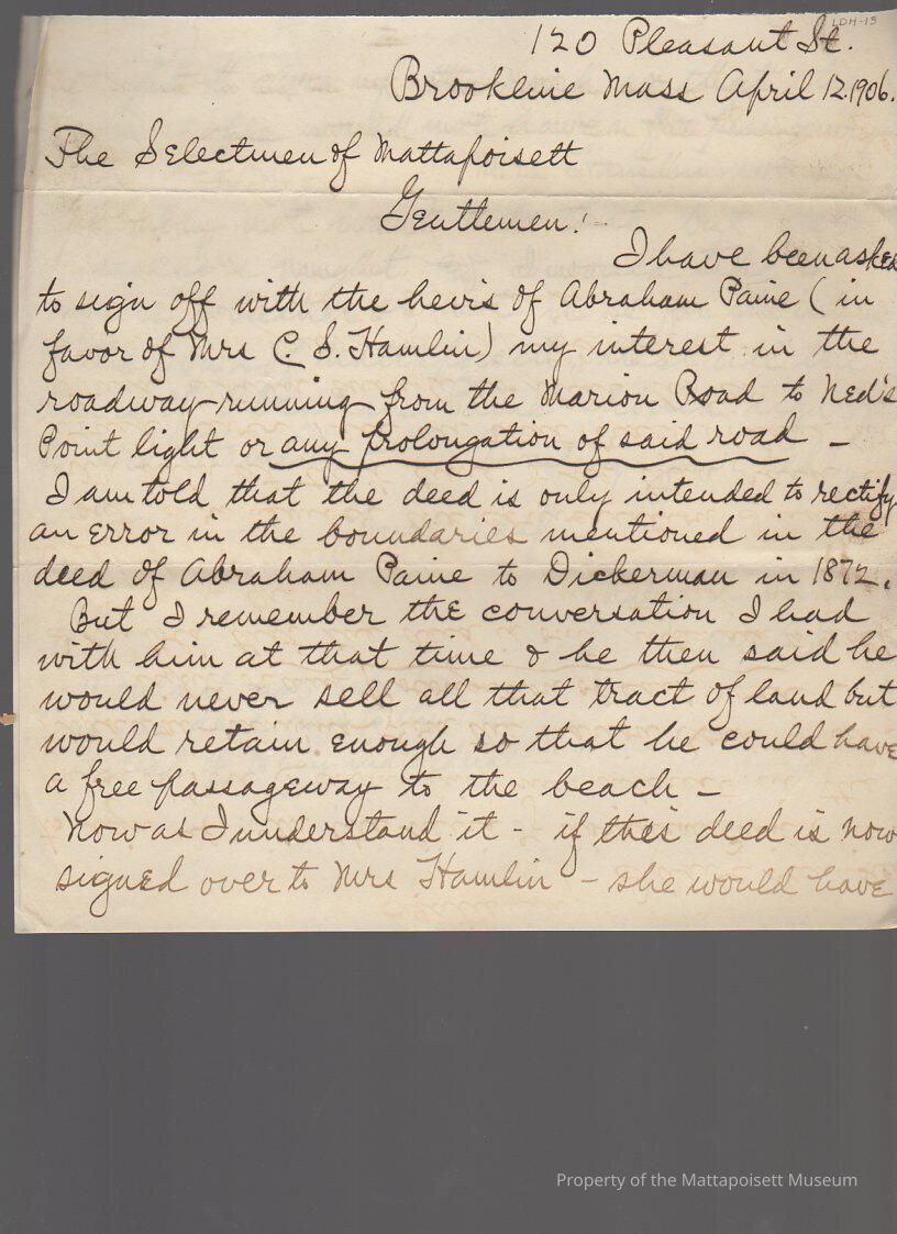Letter to The Selectmen of Mattapoisett from Mary A. Paine (per A. B. P.) regarding tract of land being transferred to Mrs. C. S. HamlinCollection