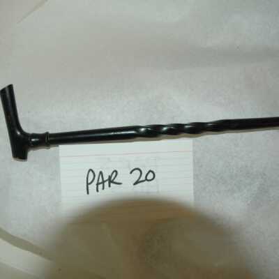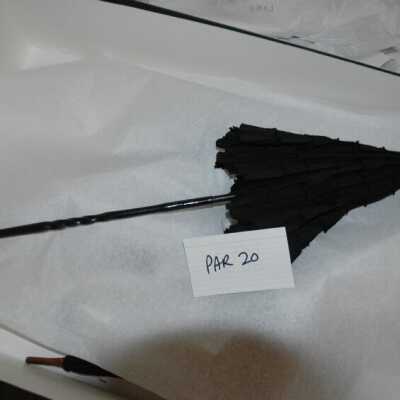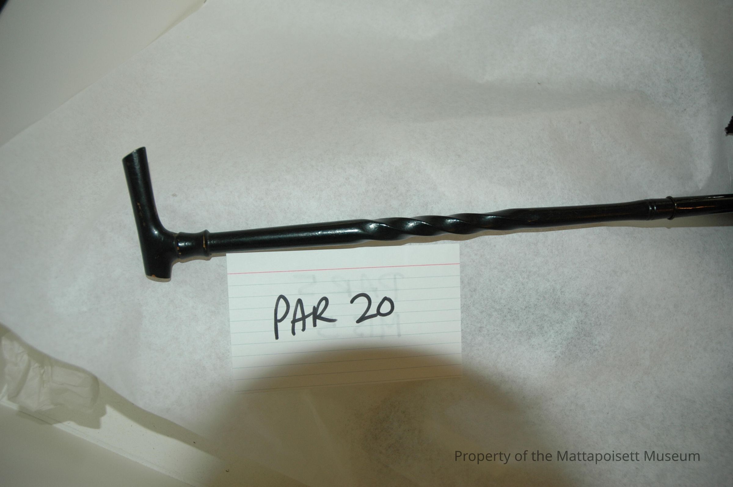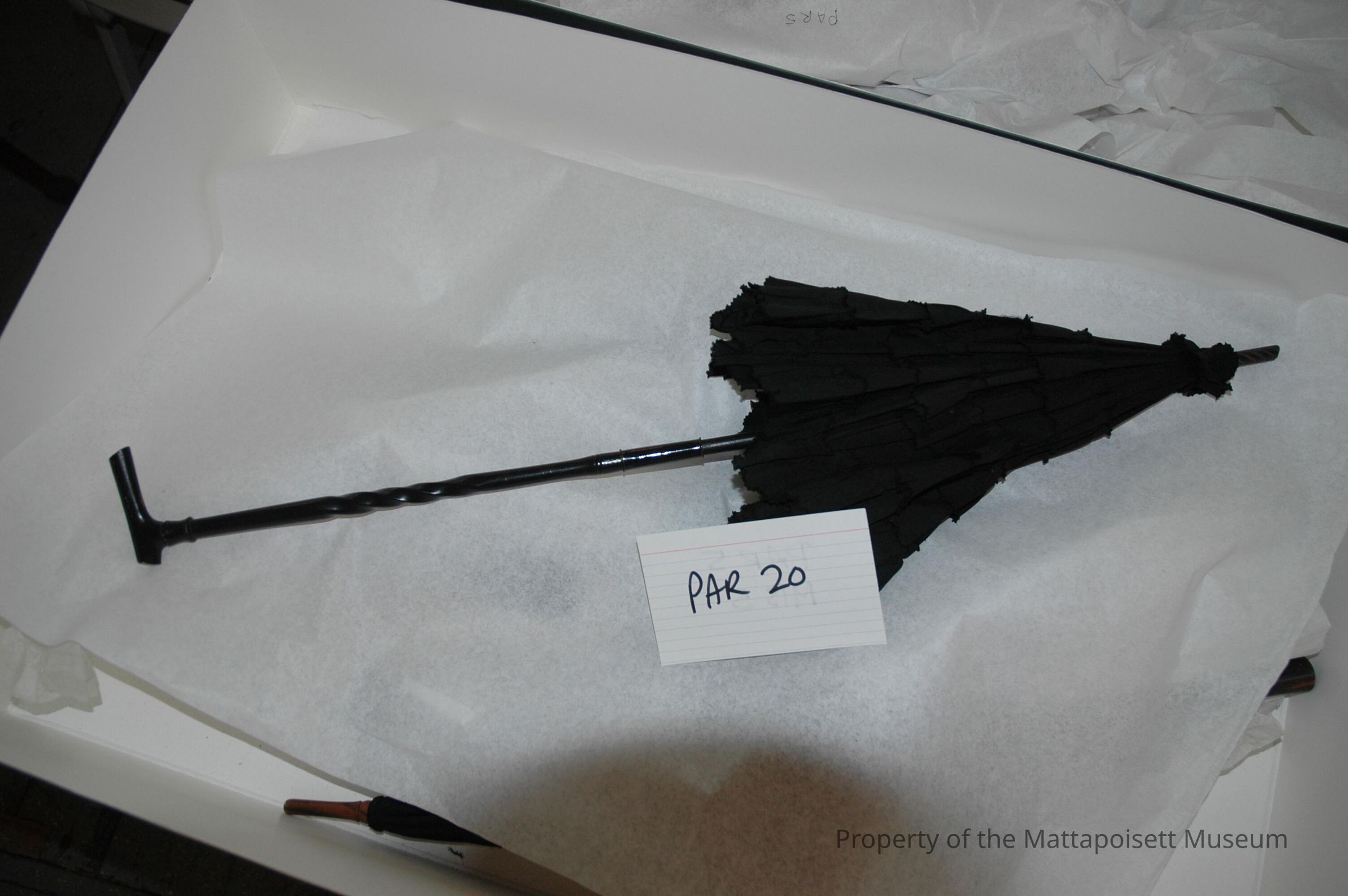 Black silk with ruffles. Carved, black wooden handle. Folds in half.Collection