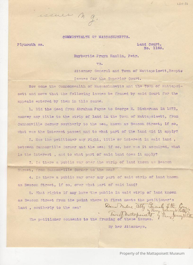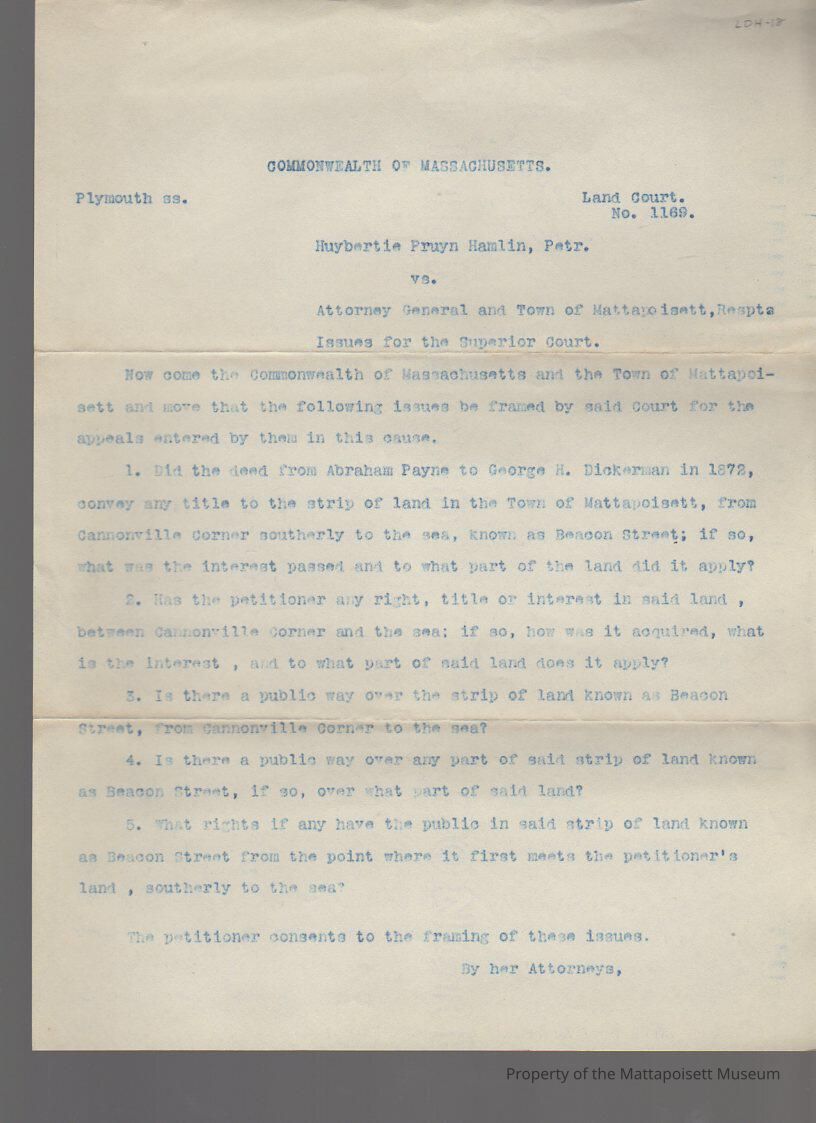 Issues for the Superior Court in the case of Huybertie Pruyn Hamlin and the Attorney General and the Town of Mattaposiett. Following issues be framed by said court for the appeal entered.Collection