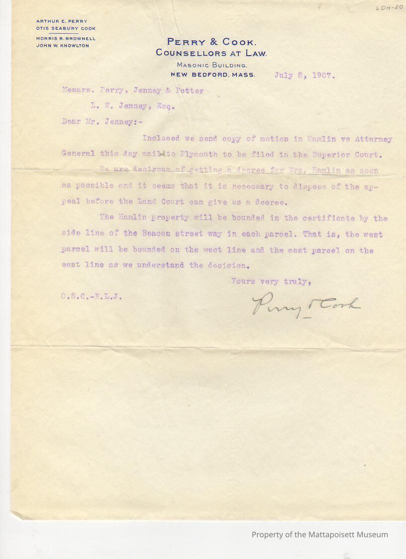 Letter to Lester W. Jenney from Perry & Cook, Counsellors at Law, representing Huybertie Pruyn Hamlin. Describes particulars of real estate boundries.Collection