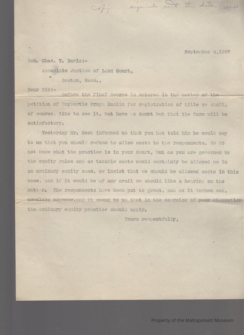 Letter to Hon. Chas. T. Davis, Associate Justice of Land Court requesting to see registration of title in case of Huybertie Pruyn Hamlin.Collection