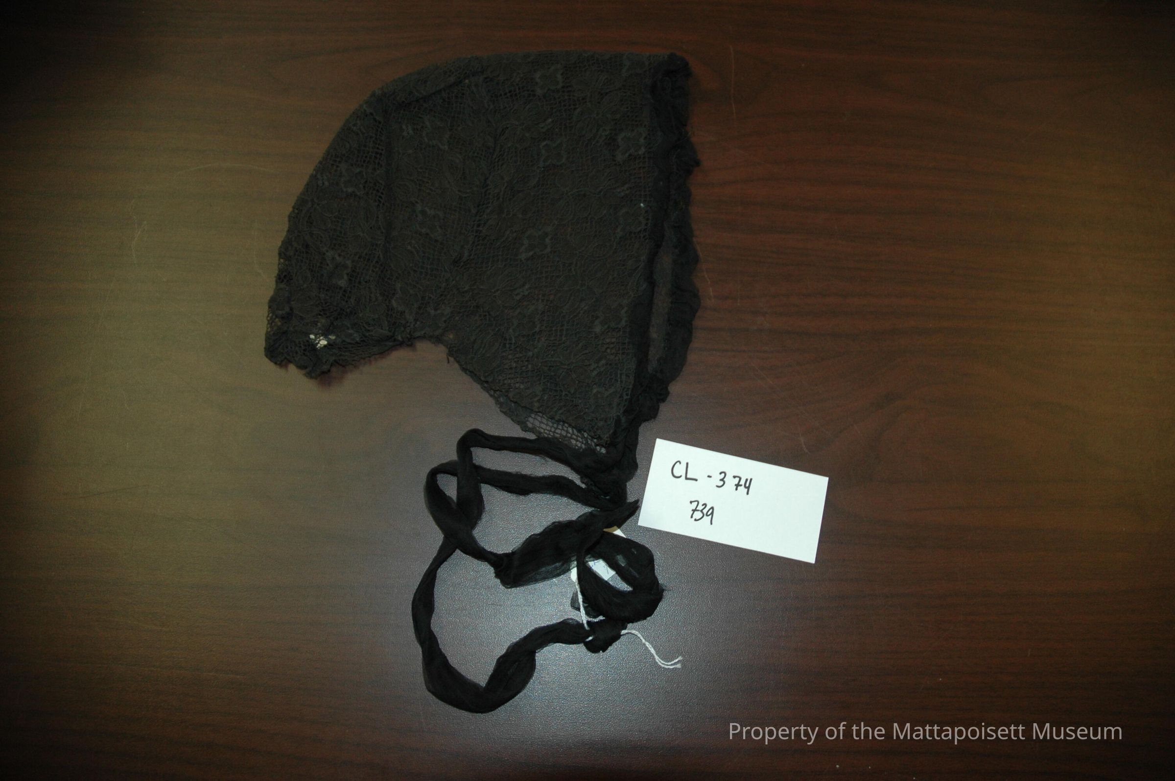 Black lace bonnet, with sheer black ties. Label: "Stowell"Collection
