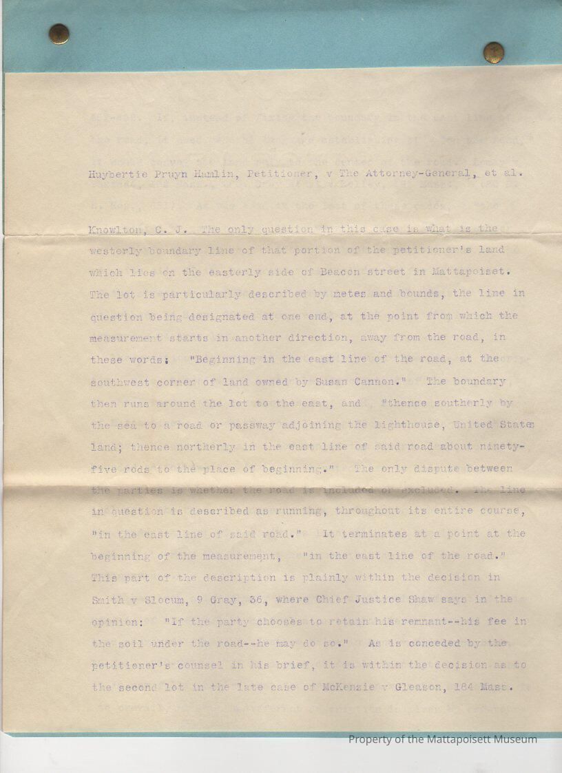 Memorandum between Description of history of title of real estate in contention with Hamlin and Town of Mattaposiett near Neds Point. Also references previous court cases.Collection