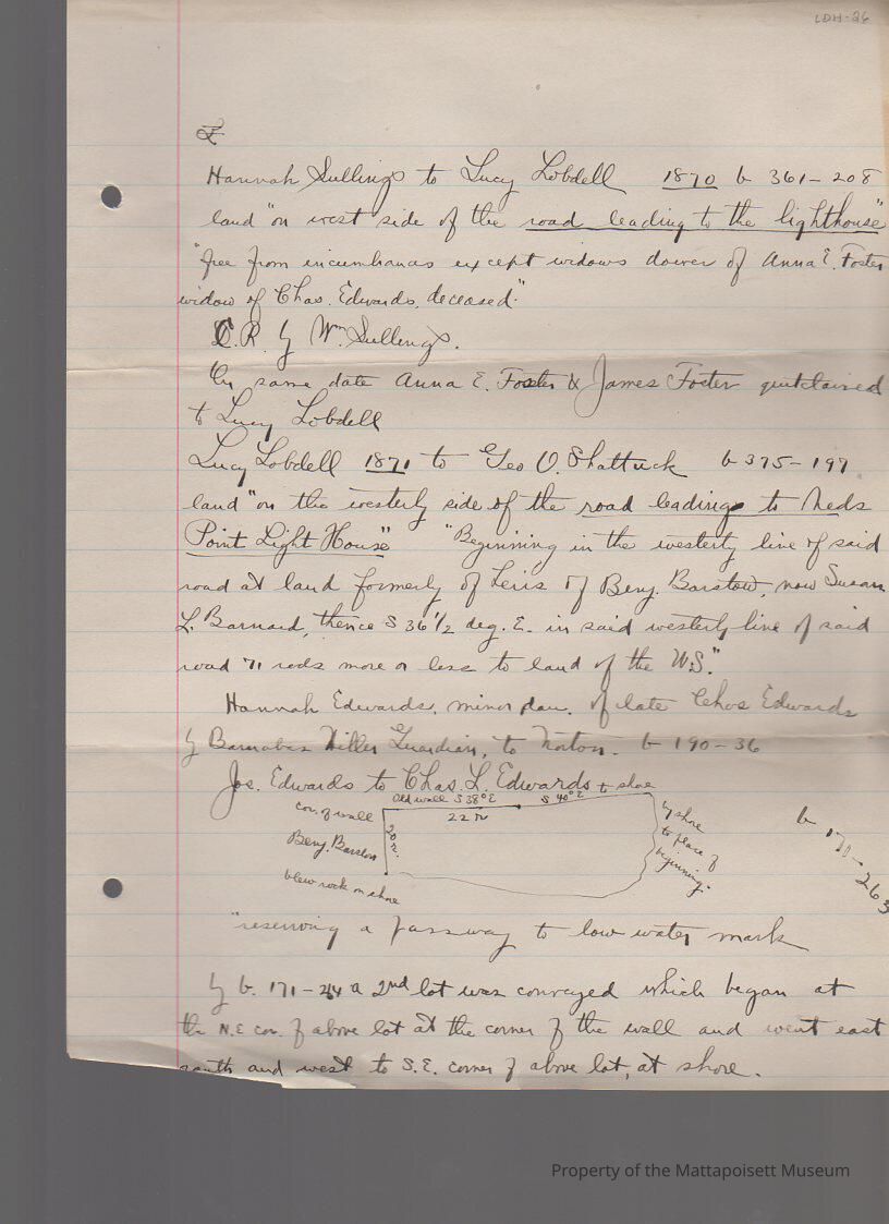 Description of history of title of real estate in contention with Hamlin and Town of Mattaposiett near Neds Point. Also references previous court cases. Continuation of 0500.2.103.Collection