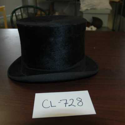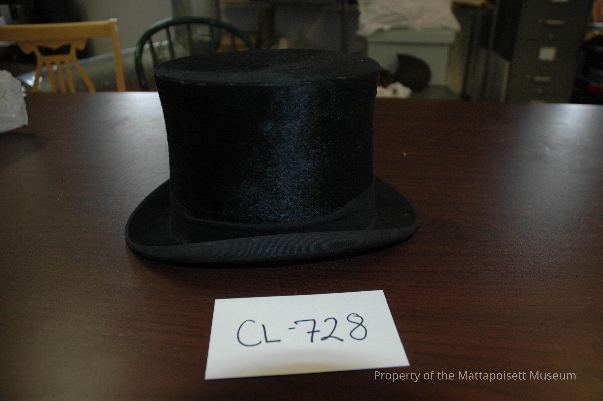 Black top hat with ribbon detail and silk lining. Label: "Superior Quality New York"Collection