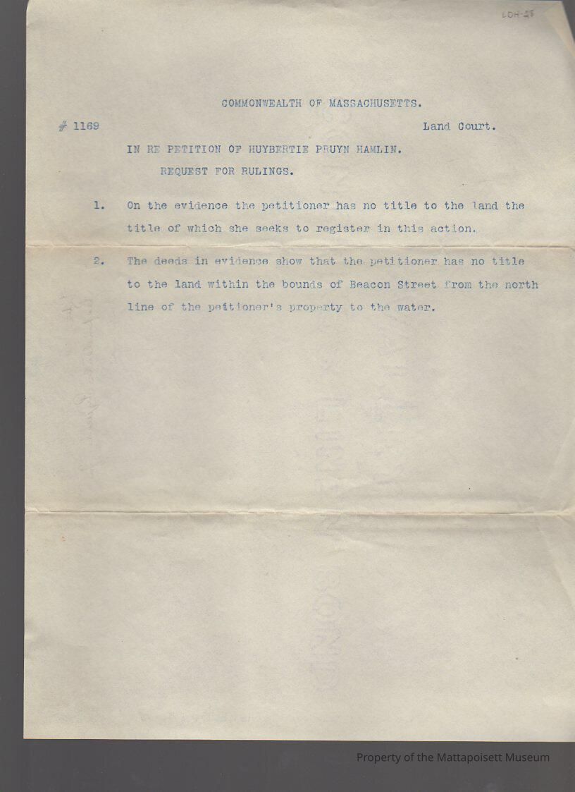 Request for rulings in case of Huybertie Pruyn Hamlin vs. Attorney General et. al. Notes that the petitioner has no title, nor are there deeds in evidnece.Collection