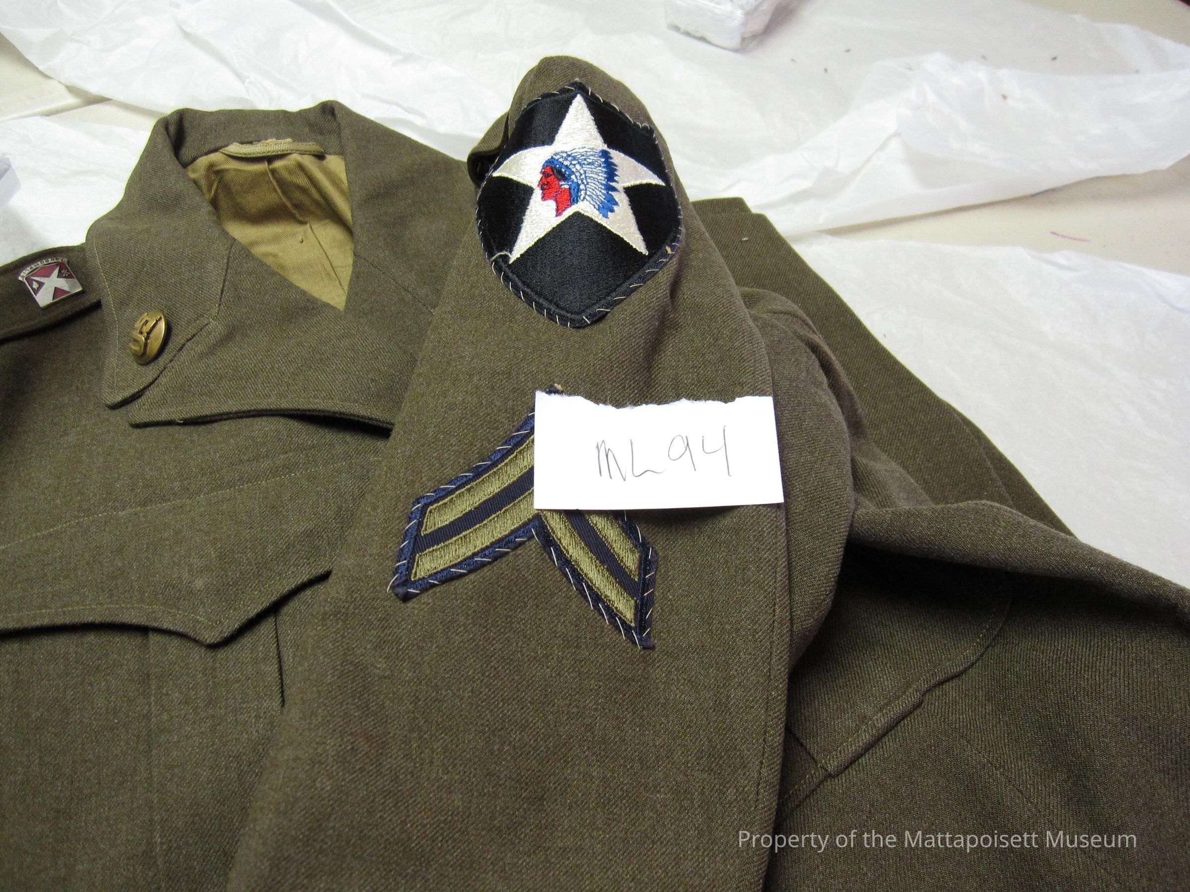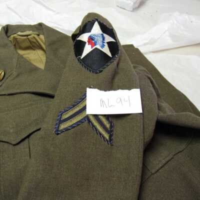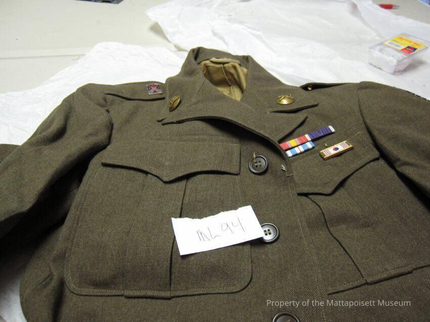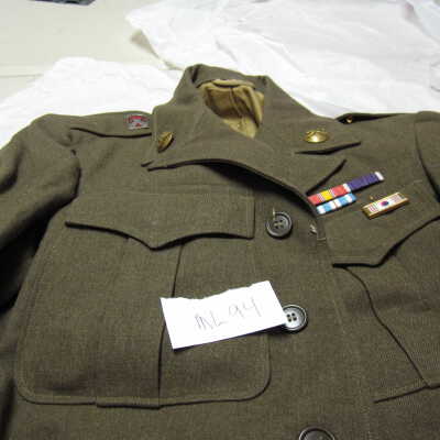 Richard Cole's Korean War uniform, including jacket and pants. Olive green wool, with badges and insignia.Collection
