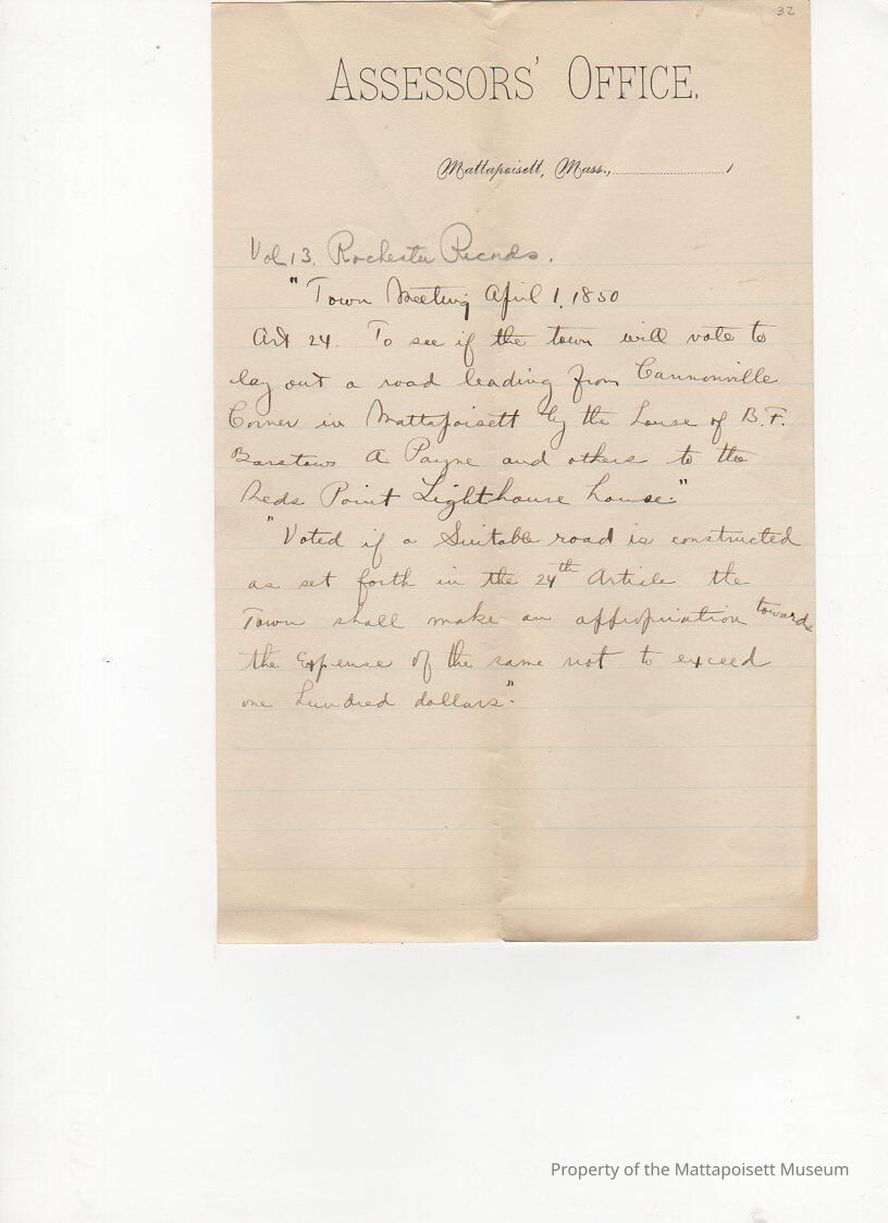 Vol. 13 Rochester Records. Town meeting, April 1, 1850. "To see if the town will vote to lay out a road leading from Cannonville Corner by the house of B. F. Barstow, A. Paine and others to the Neds Point Lighthouse house.Collection
