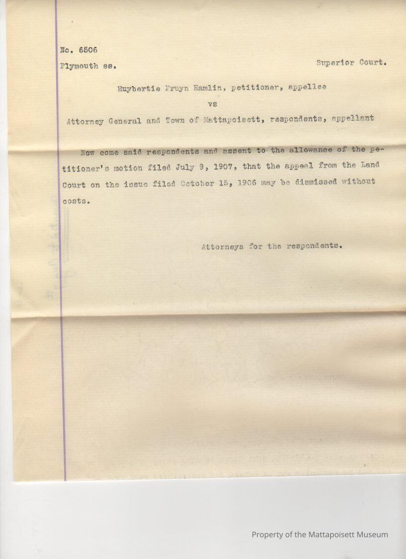 Huybertie Pruyn Hamlin, petitioner, appellee vs. Attorney General et. al. and Town of Mattaposiett, respondents, appellant. Motion filed July 9, 1907, that the apeal from the Land Court on the issue filed October 15, 1906 may be dismissed without costs.Collection