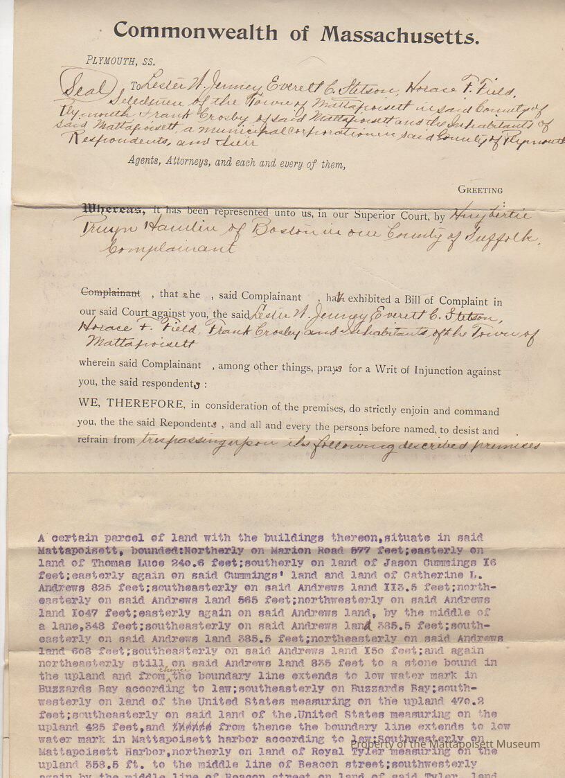 Complaint against Selectmen of the Town of Mattapoisett for trespassing upon described premisesCollection