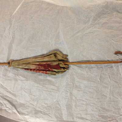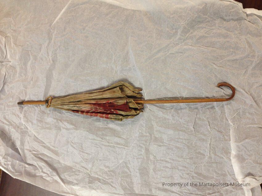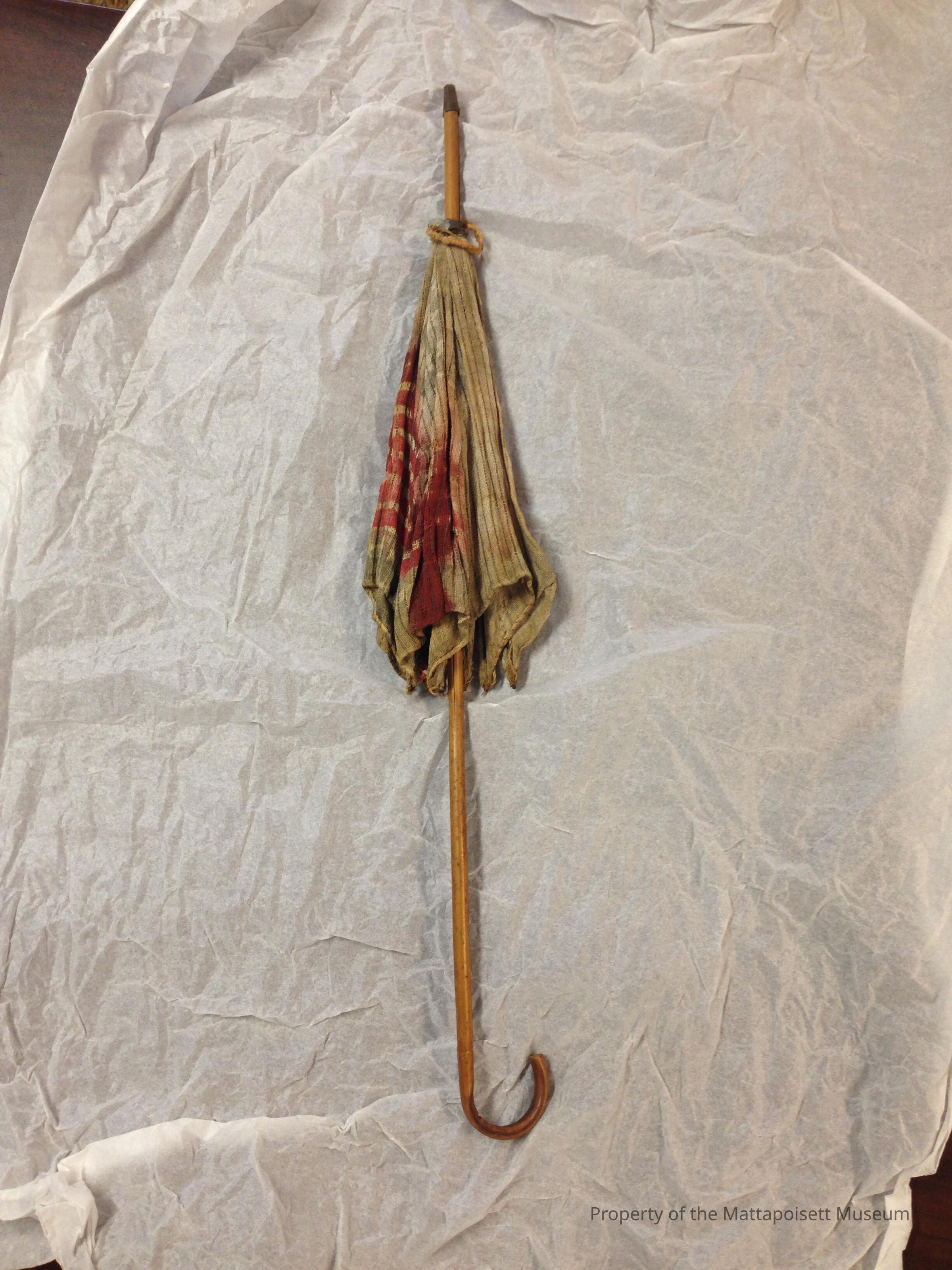 Parasol with wooden J-shaped handle. Cotton with red, white, and blue stars and stripes pattern, very faded.Collection