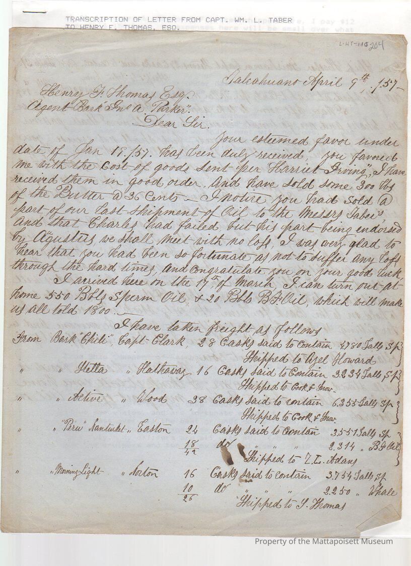 Letter to Henry F. Thomas, agent for the Bark John A. Parker, from Capt. William L. Taber. Transcription. Taber ThomasCollection