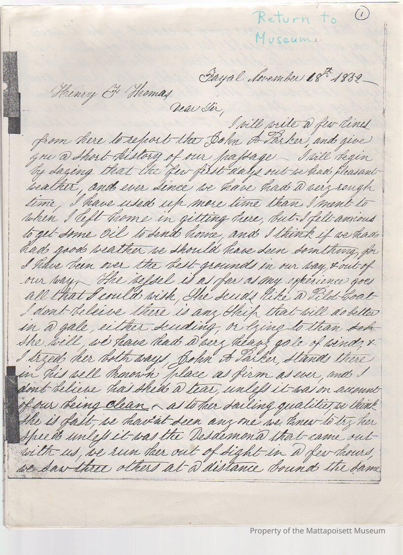 Letter to Henry F. Thomas, agent for the Bark John A. Parker, from Capt. William L. Taber in Fayal. Taber ThomasCollection