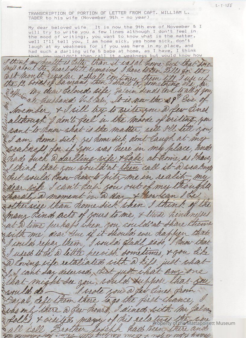 Letter to "My Dear Beloved Wife" from Capt. William L. Taber. Transcript.Collection