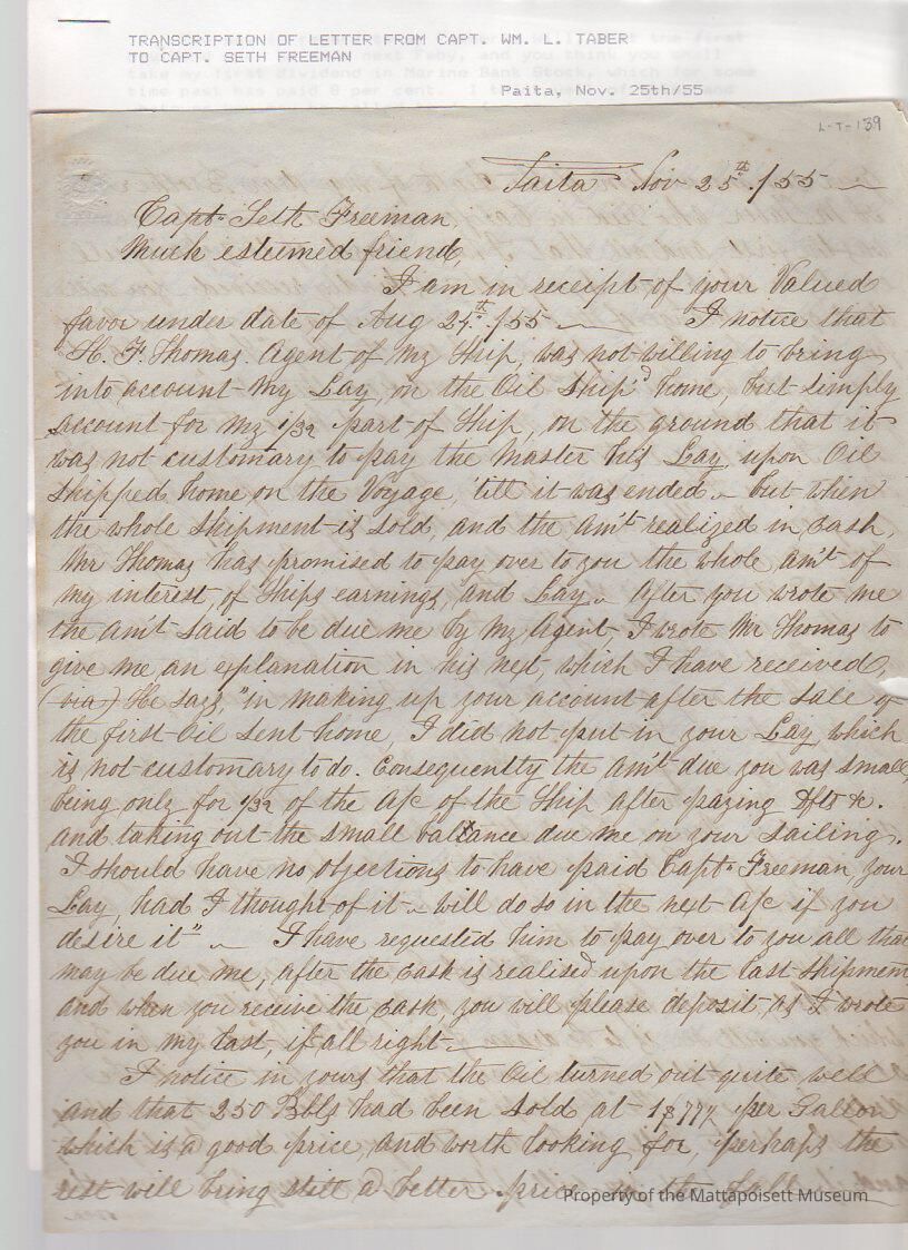 Letter to Capt. Seth Freeman from Capt. William L. Taber in Piata. Transcription.Collection