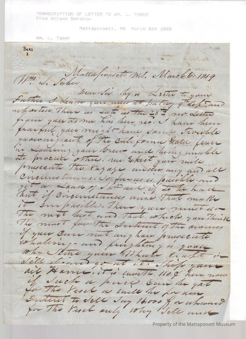 Letter to Capt. William L. Taber from Wilson Barstow in Mattapoisett. Transcription.Collection