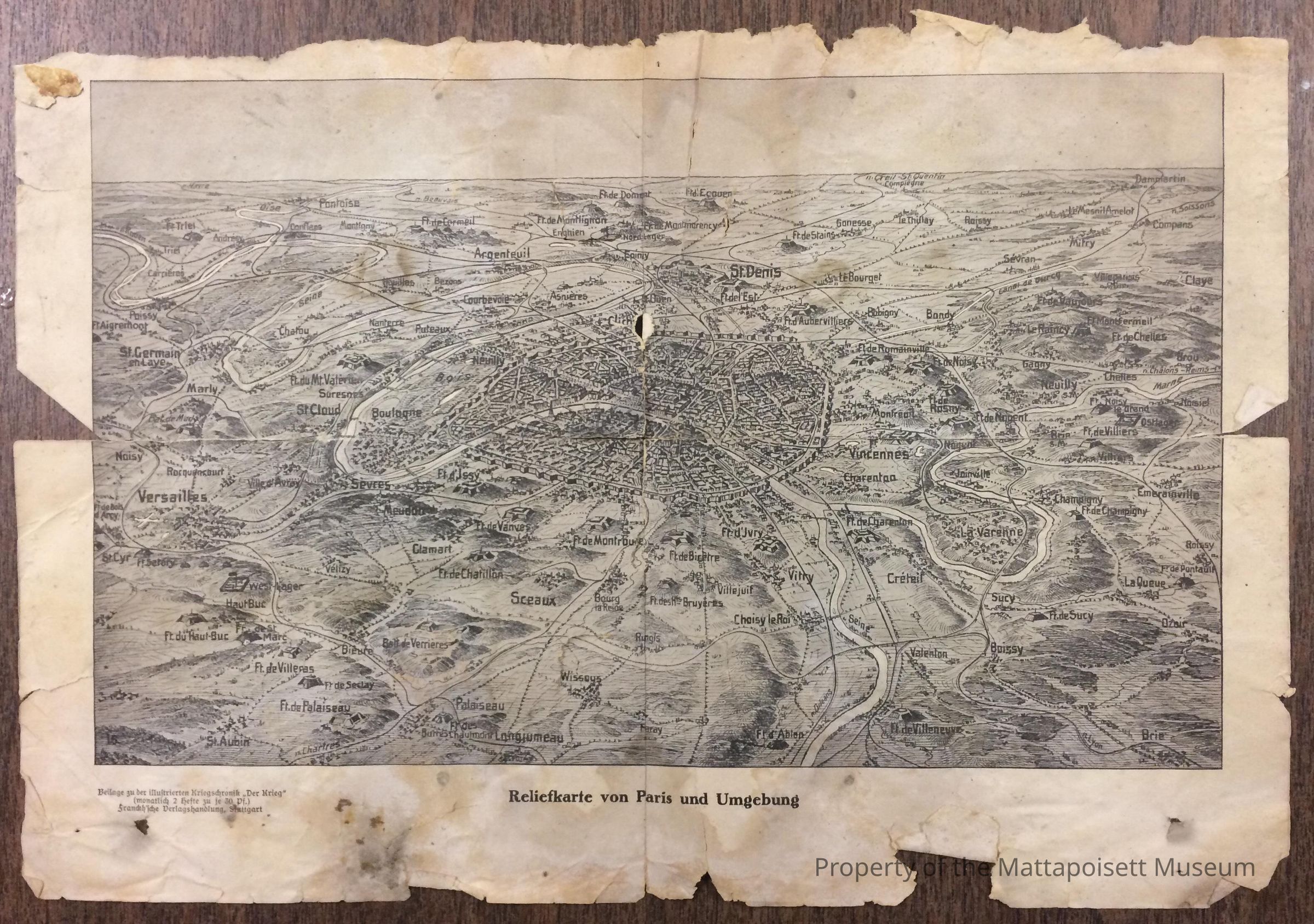 German map of Paris and surroundings. This map was found in a German dugout at the end of WWI and brought back to Mattapoisett by a returning soldier.Collection